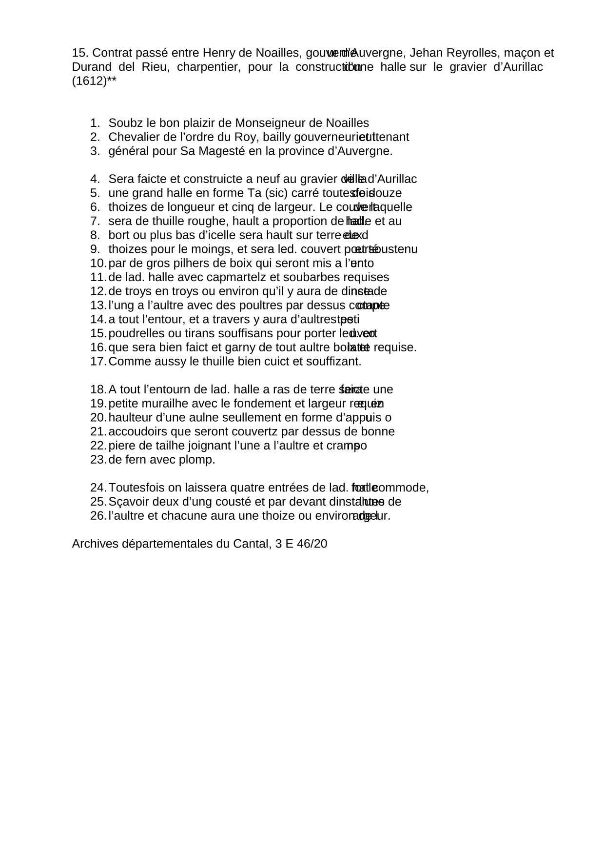 Contrat passé entre Henry de Noailles, gouverneur d’Auvergne, Jehan Reyrolles, maçon et Durand del Rieu, charpentier, pour la construction d’une halle sur le gravier d’Aurillac (1612) Transcription (6.6 Ko)