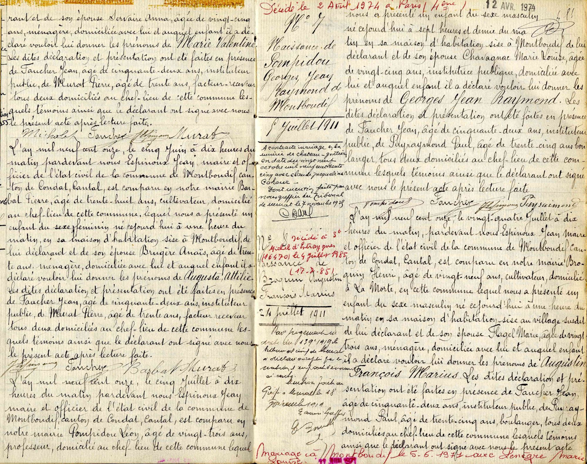- M. Georges Pompidou, décédé à Paris (4earrondissement) le 2 avril 1974, comme l’indique en rouge l’autre mention marginale.