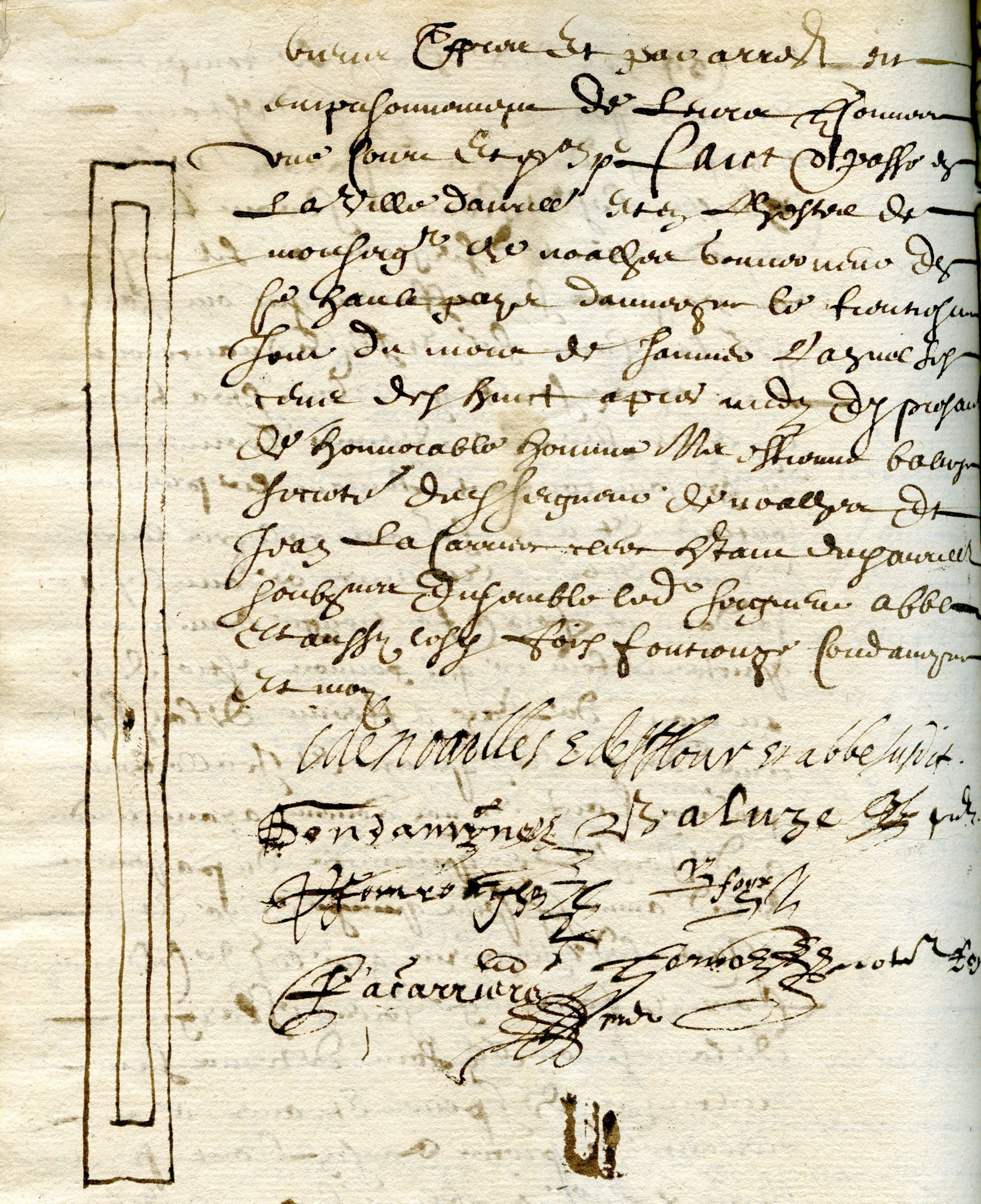 Cet acte, passé chez Fornols, notaire à Aurillac, permet aux parties en présence de régler un différend en abandonnant la procédure judiciaire. L’acte porte sept signatures : celle de l’abbé (« C. de Noailles E. de St Flour et abbé susdit ») et de son secrétaire Étienne Baluze (peut-être le grand-père du célèbre historien limousin homonyme), celle des trois compères (Condamine, Foix et Fontrouge) et, enfin, celle des deux notaires, Fornols et son collègue Lacarrière.