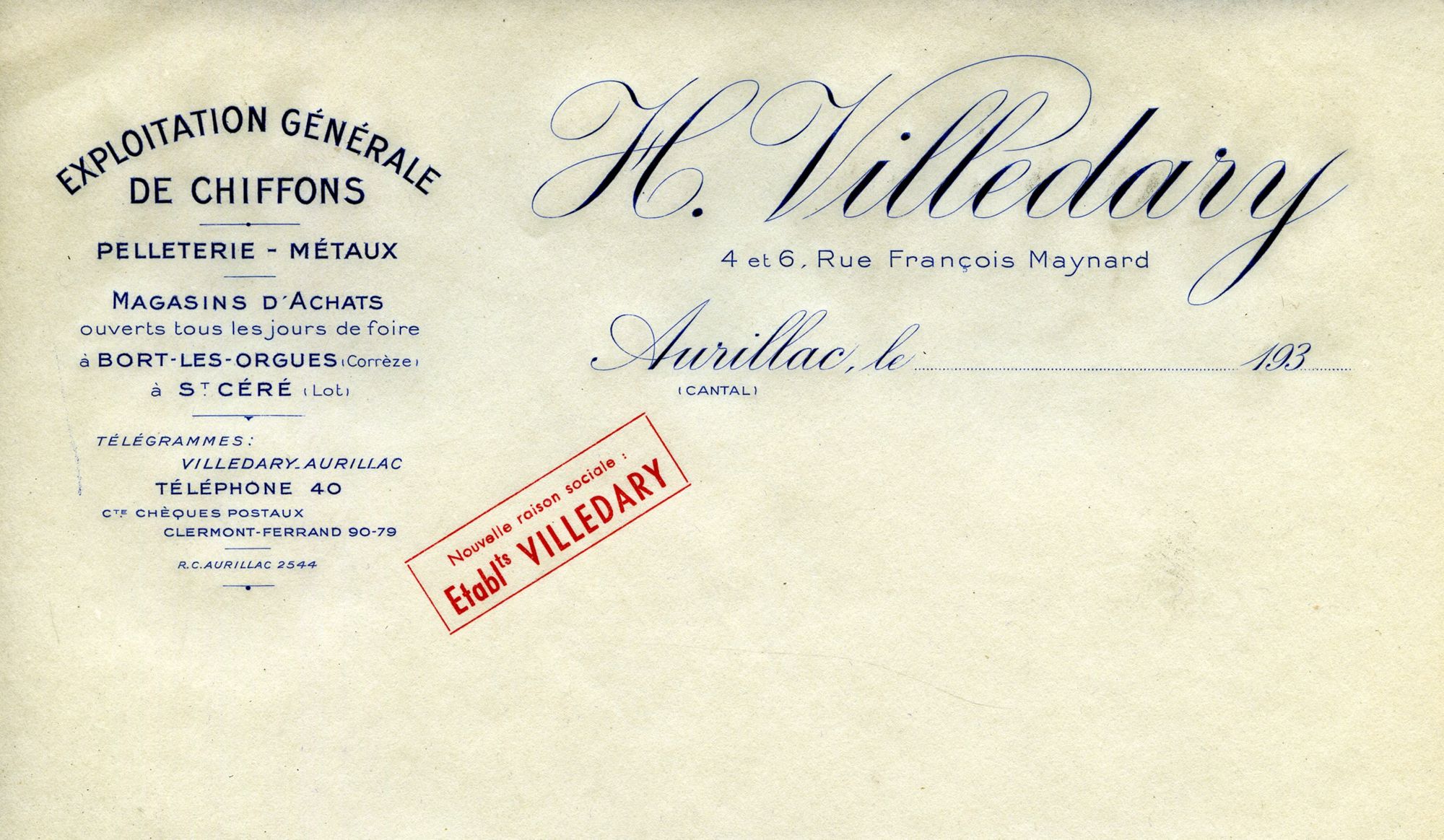 Un usager des Archives départementales a fait récemment un don original : il s’agit des registres journaliers d’achat et de vente des établissements Villedary, « exploitation générale de chiffons, pelleterie et métaux » à Aurillac (4-6, rue François Maynard) et Bort-les-Orgues. Ces documents étaient – ironie du sort – promis à la poubelle et entreposés dans la rue, près de la gare d’Aurillac.