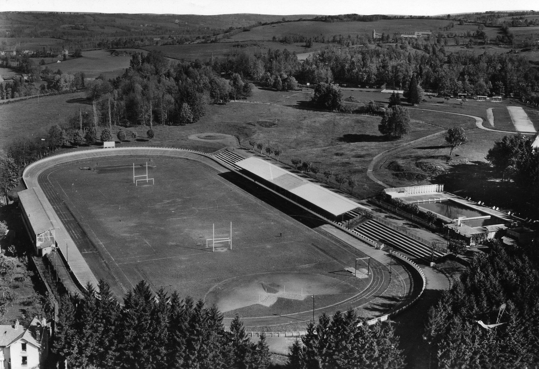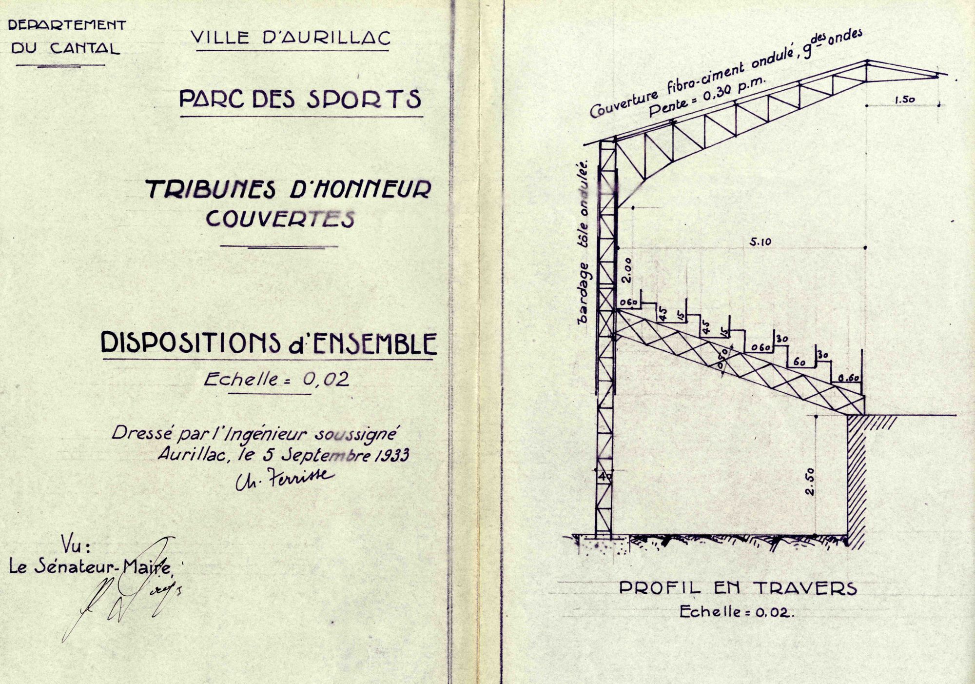 C’est en effet en 1933 que la ville d’Aurillac décide de doter le terrain « foot-ball rugby » de son parc des sports de « tribunes d’honneur couvertes, avec sous-sol aménagé », pour y accueillir 900 spectateurs. Le club de rugby évolue alors en division d’excellence et s’apprête à fêter son trentenaire (1904-1934). Les plans des tribunes sont dressés par l’architecte Charles Terrisse qui, avec son confrère et concurrent Pierre Croizet, se partageait les aménagements et les constructions de ce temps.