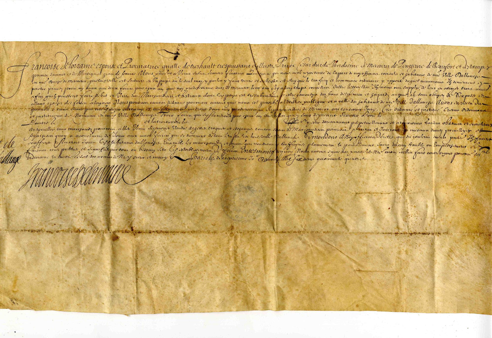 A cette date, le duc de Mercoeur est César de Vendôme, fils illégitime d’Henri IV et de Gabrielle d’Estrées. Il a épousé en 1609 Françoise de Lorraine, qui lui apporte entre autres le duché de Mercoeur. Or, depuis 1641, Françoise de Lorraine bénéficie d’une procuration générale par laquelle son mari l’autorise à administrer tous leurs biens. Ce n’est donc pas César de Vendôme mais sa femme qui signe cette création de foires. Un sceau pendant authentifiait également le document à l’origine : le parchemin était replié sur son dernier tiers et incisé horizontalement afin de faire passer une bandelette de parchemin sur lequel était apposé le sceau. Celui-ci a disparu, mais l’incision de part et d’autre du pli est toujours visible.