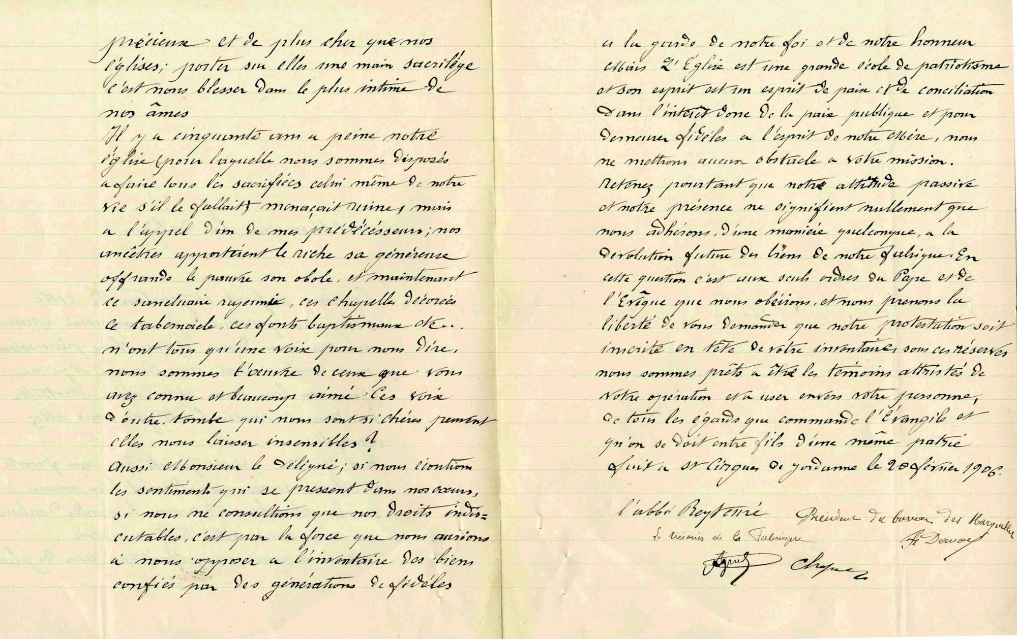 Cependant l'abbé Reyt est aussi bon chrétien qu'écrivain, il se refuse donc à user de violence envers son prochain. L'" esprit de paix et de conciliation " de l'Eglise lui dicte de ne pas s'opposer à l'accomplissement de la mission du délégué à l'inventaire, même s'il la condamne. C'est sur cette note œcuménique que s'achève la lettre de l'abbé, signée également par le président et le trésorier de la fabrique.