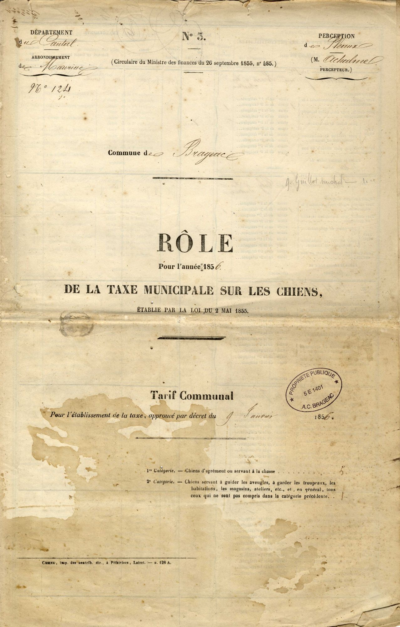 Ce document du mois issu des archives communales de Brageac présente le premier rôle de la taxe sur les chiens, pour l’année 1856. Sur la première page apparaît le tarif : 5 francs pour les chiens de 1ère catégorie et 1 franc pour ceux de la 2e catégorie. Onze foyers ont déclaré onze chiens en 1856 dans cette commune qui compte alors 430 habitants, ce qui semble peu pour une commune rurale. Y aurait-il eu quelques résistances ? Le montant de la taxe annuelle est de 11 francs, puisque les chiens déclarés sont uniquement des gardiens de troupeaux et d’habitations, et non des chiens de chasse. Face à ces chiffres, il serait intéressant de savoir si le maire contrôlait ses administrés, et comment.