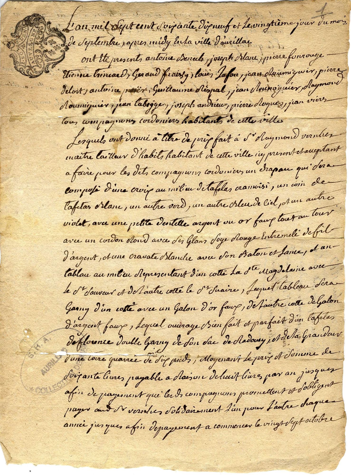Ce document est un prix-fait, ancêtre du devis, passé entre seize ouvriers du cuir et un tailleur d’habits nommé Raymond Vernhes qui, cette fois, n’emploiera pas ses talents à réaliser robes et culottes. Les travaux concernent un drapeau et laissent peu de place à l’imagination du tailleur, puisque les détails en sont minutieusement décrits, de la matière à l’iconographie, en passant bien sûr par la couleur. De la taille d’une toise carrée, c’est-à-dire environ 2 mètres carrés, il sera composé en taffetas : une croix large croix rouge divise le drapeau et laisse dans les coins quatre carrés colorés, un blanc, un vert, un « bleu de ciel » et un violet. Le tout est entouré d’un liseré de dentelle argentée ou dorée (il est bien précisé qu’il s’agira d’« argent ou or faux », les fils métalliques étant certainement trop chers pour les moyens des cordonniers) et doit être livré avec sa hampe en bois, laquelle sera agrémentée d’un cordon à gland de soie rouge incrustée de fils argentés et d’une cravate blanche. Cette bande d’étoffe, sans doute en soie, était nouée en haut de la hampe. Elle pouvait être brodée ; sa sobriété ici contraste avec le reste du drapeau.