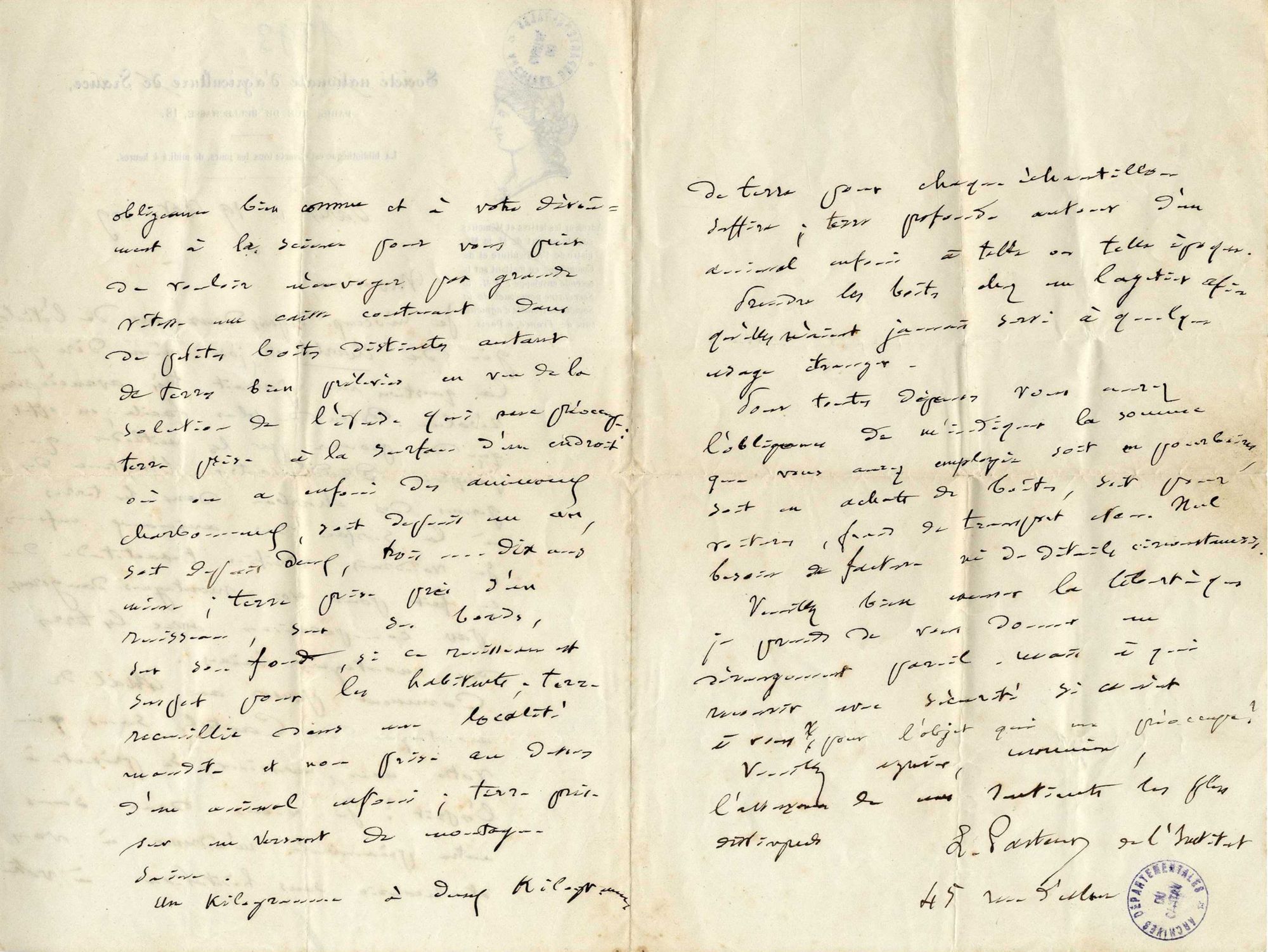 Avec quelques éloges (« à qui recourir avec sécurité si ce n’est à vous pour l’objet qui me préoccupe ? »), le microbiologiste émet ses recommandations au vétérinaire : quel type de terre prélever, de quelle provenance, en quelle quantité. L’objectif est de démontrer que la terre à proximité des animaux malades inhumés est contagieuse, contrairement aux terres saines. La qualité des boîtes est également précisée : il faudra qu’elles soient fournies par un layetier, un fabriquant de layettes, autrement dit de caisses en bois, afin qu’elles n’aient jamais servi et ne soient donc pas contaminées par un quelconque contenu précédent. Tous les frais, « soit en pourboires, soit en achats de boîtes, soit pour voitures, frais de transport », seront remboursés sur parole.