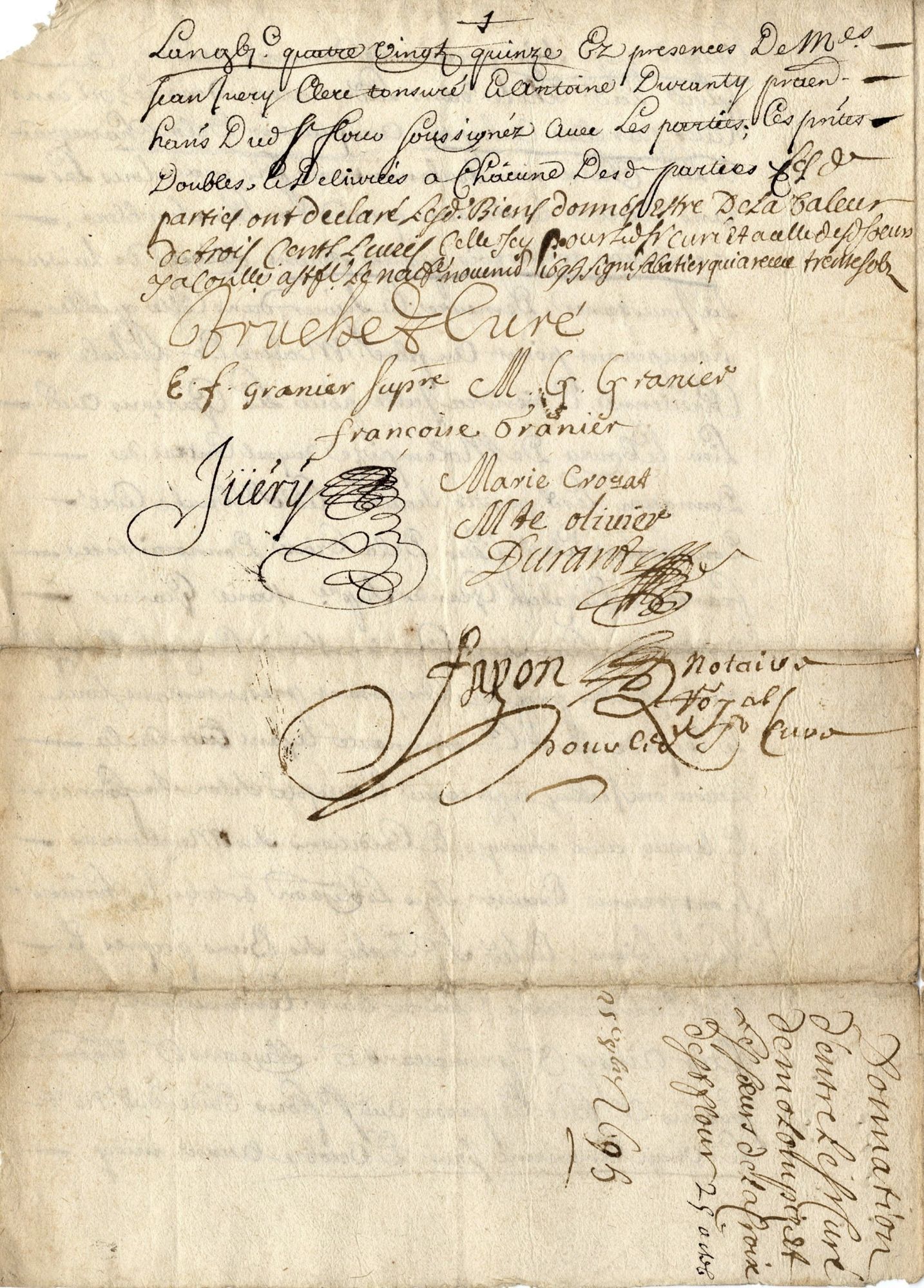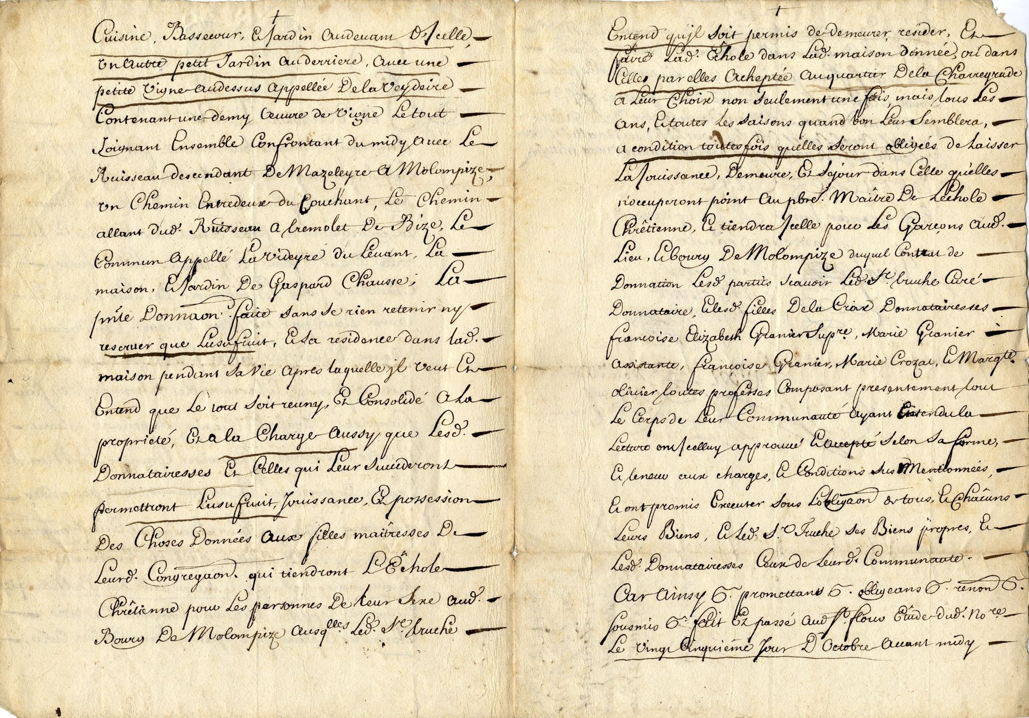 Cette initiative est due au curé de Molompize, Jean Truche, qui par cet acte exposé fait don à la communauté des filles de la Croix, congrégation enseignante établie à Saint-Flour au moins depuis 1661, d’une maison dans le bourg de sa paroisse, avec jardin et vigne, le 25 octobre 1695. En contrepartie, les sœurs s’engagent à détacher comme maîtresses à Molompize deux d’entre elles « sachant bien lire, écrire, chifrer et faire les petits ouvrages convenables à leur sexe ». Il va de soi qu’à ces enseignements de base s’ajoutent le catéchisme et les principes de la foi. Afin que ces dispositions puissent profiter à toutes les familles, l’école sera gratuite.
