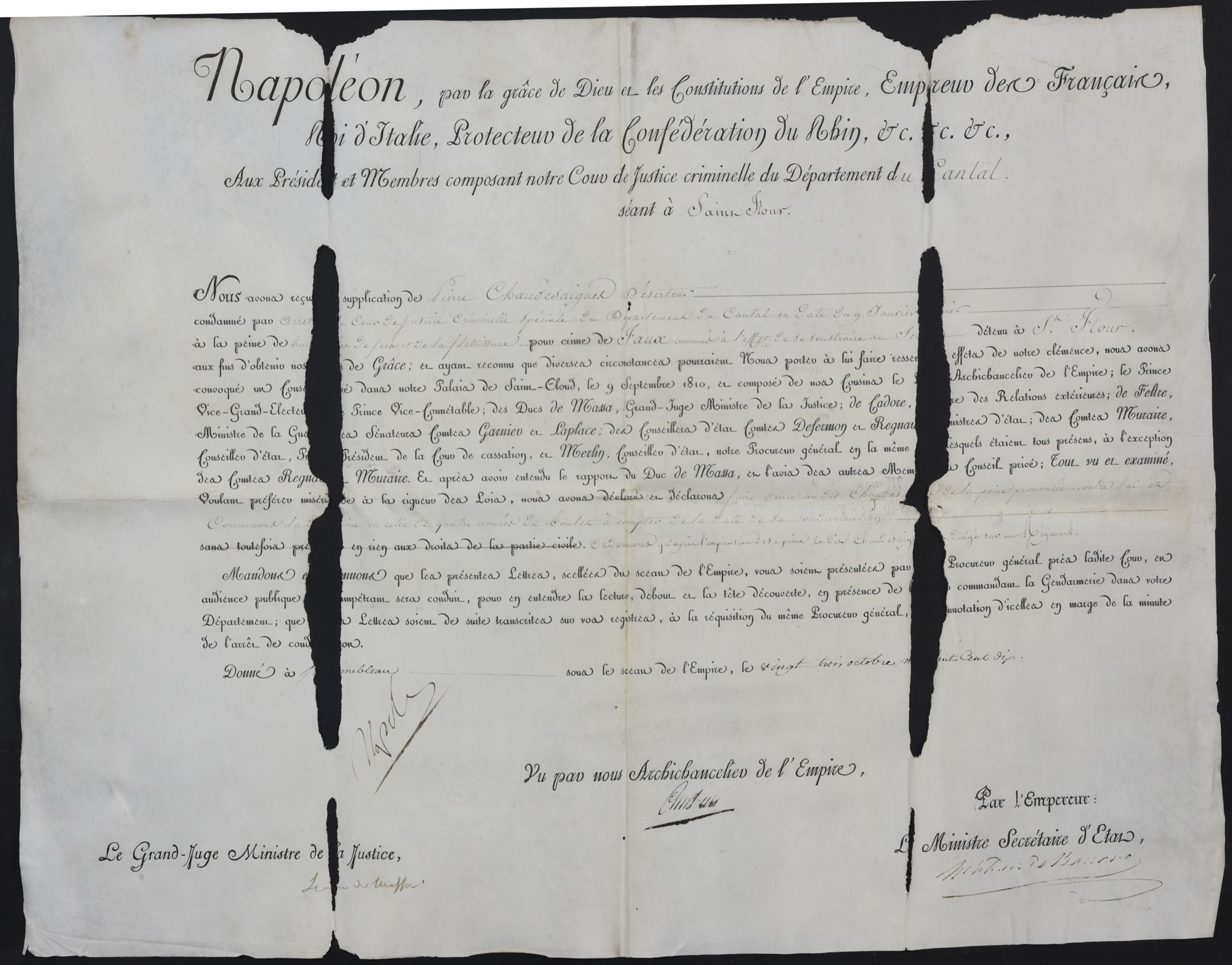 Imprimé sur parchemin, il s’agit d’un formulaire complété à la main, mais sa taille, les caractères typographiques raffinés ainsi que les signatures en imposent. Le sceau, quant à lui, est un timbre sec imprimé en relief au bas du parchemin et représentant l’aigle impérial ; il est presque invisible. Lues en audience publique de la cour de justice criminelle de Saint-Flour en présence du condamné, ces lettres ont ensuite été ajoutées au dossier de procédure au lieu d’être remises à l’intéressé et sont ainsi parvenues dans les fonds des Archives départementales, après quelques moments difficiles en présence de rongeurs. A quelques centimètres près, la signature de Napoléon aurait pu finir dans le ventre d’une souris…