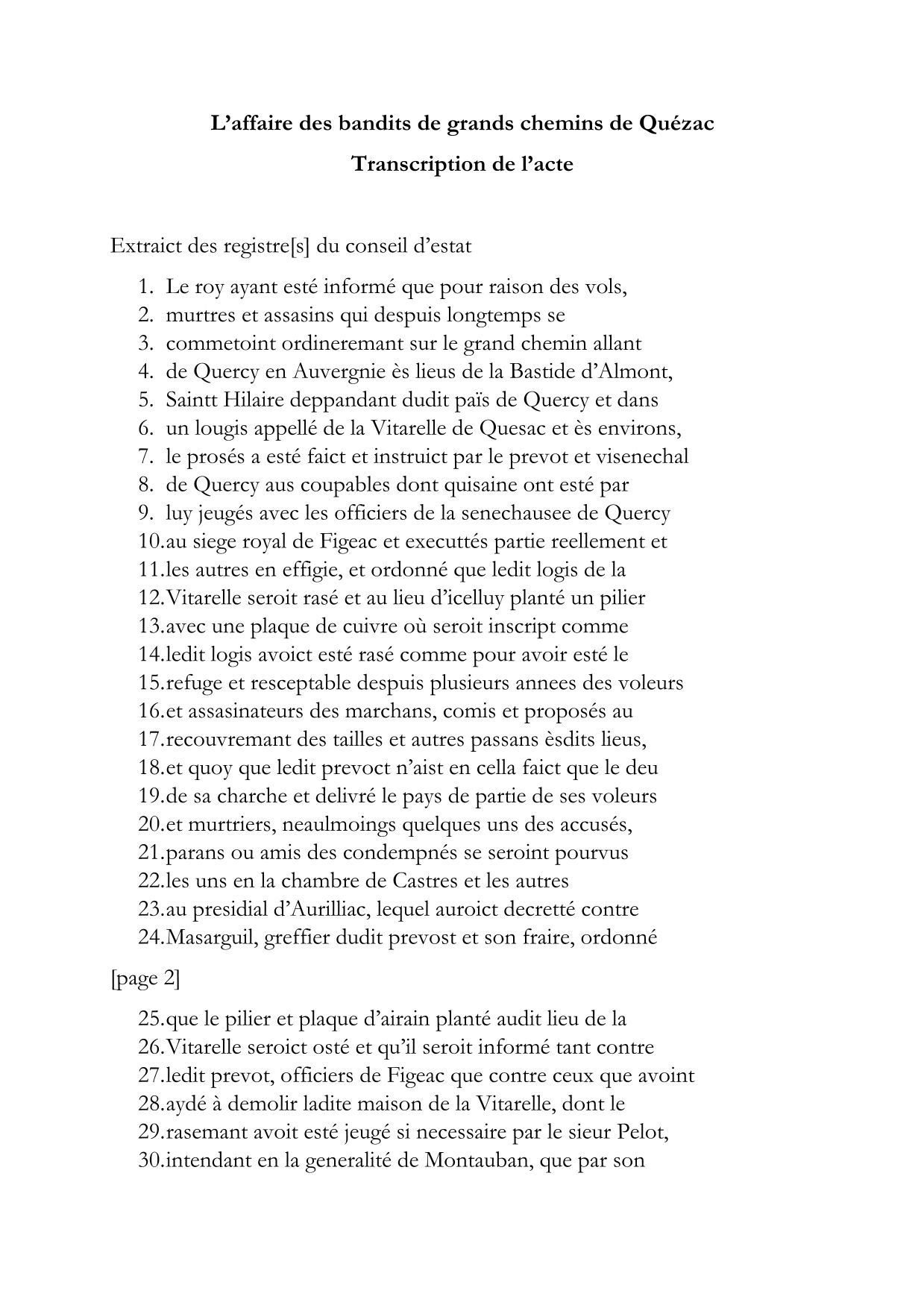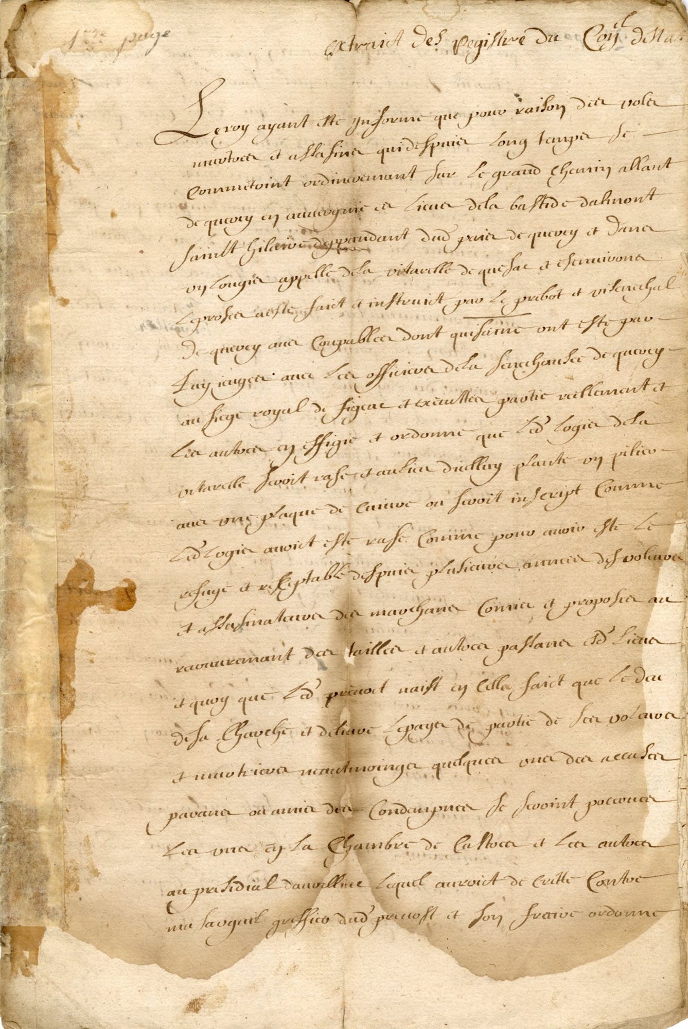 Soucieux du bien-être de ses sujets, mais aussi de la bonne santé des échanges commerciaux et de l’arrivée à bon port des deniers destinés à remplir ses caisses, le roi de France était loin de négliger ces troubles à l’ordre public. Bien qu’il soit impossible de surveiller l’ensemble du réseau routier, les représentants du roi étaient chargés de lutter contre les bandits de grands chemins, et c’est ainsi que le prévôt de Figeac peut s’enorgueillir d’une belle prise au début des années 1660. Cependant, il ne va pas rencontrer du côté de la Haute-Auvergne le soutien qu’il pouvait espérer. La copie d’un arrêt du conseil d’état de Louis XIV daté du 21 février 1664 et conservé parmi les archives paroissiales de Quézac, déposées par le diocèse aux Archives départementales, nous narre les conséquences rocambolesques d’un simple faux-pas.