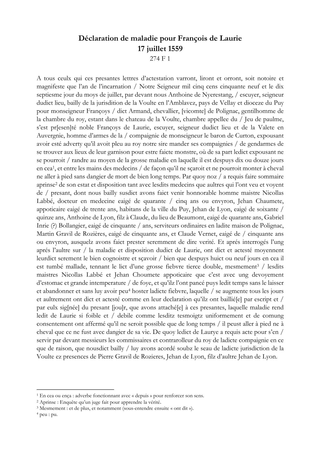 Neuf témoins pour la déclaration de maladie de François de Laurie (1559)