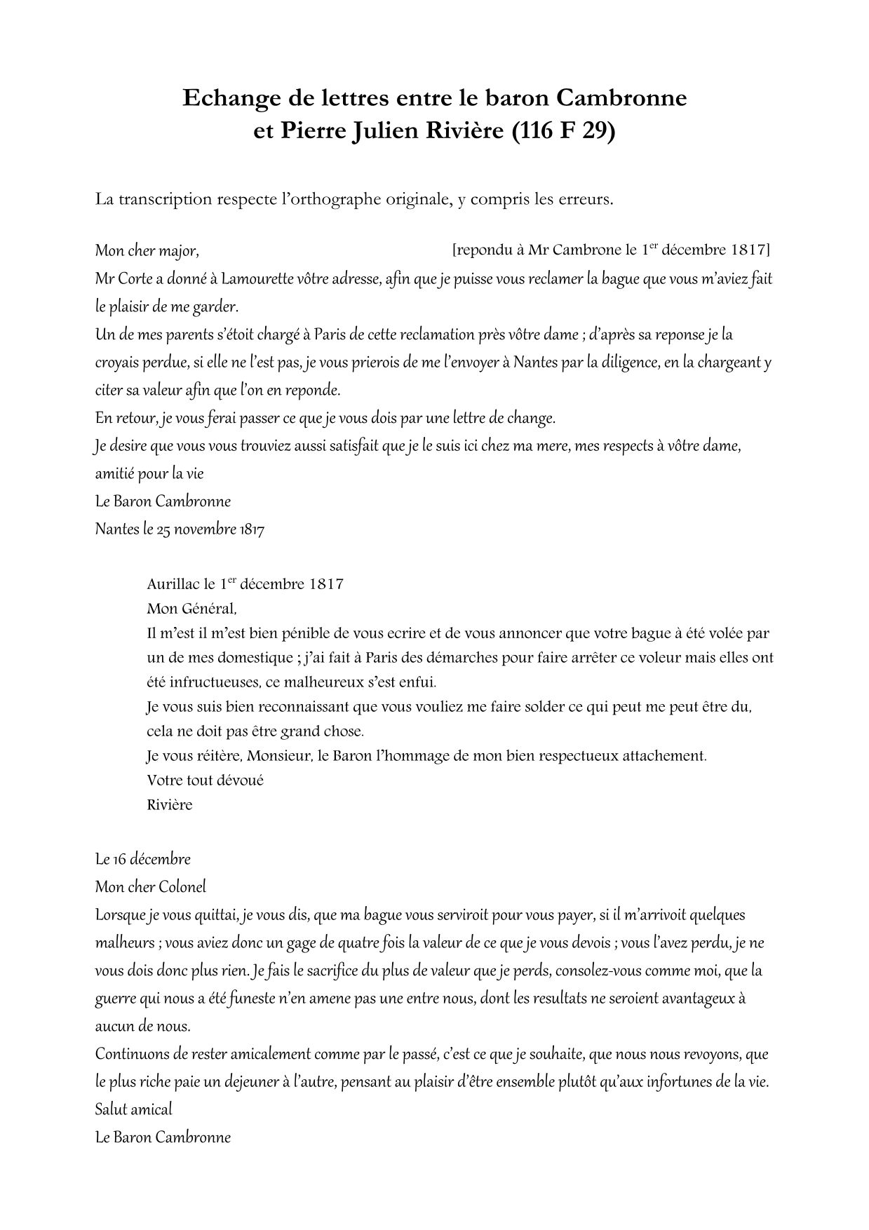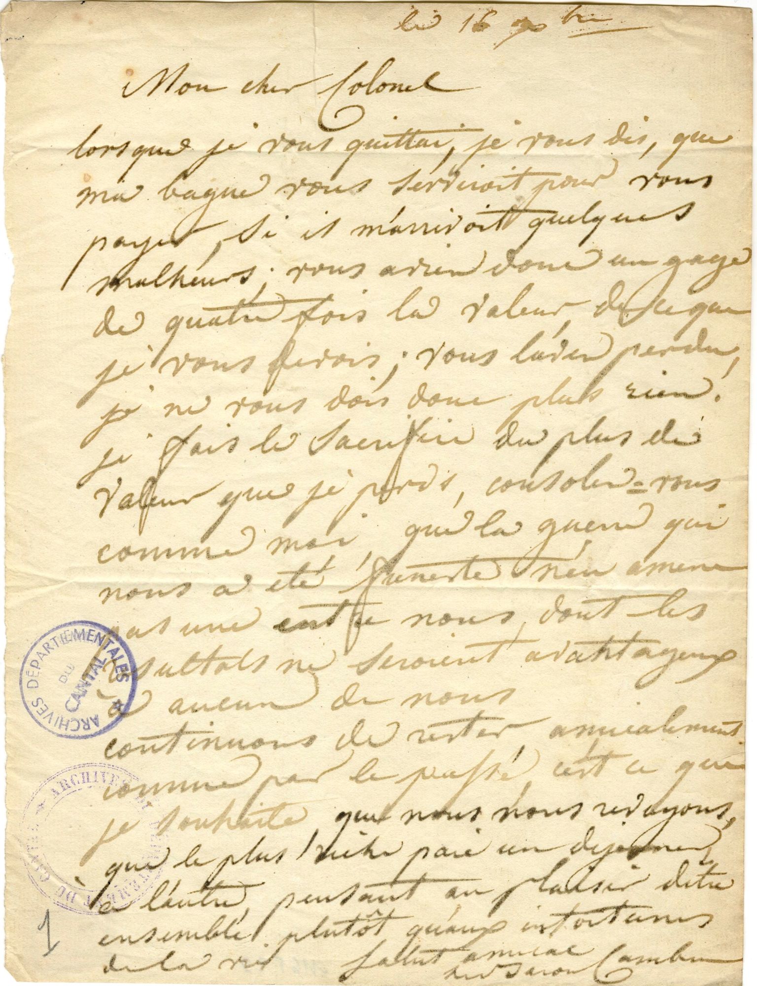 C’est donc l’image que nous gardons aujourd’hui de Cambronne, celle d’un général déterminé au caractère explosif – bien que, contrairement à l’affirmation qu’on lui prête, il ait finalement été fait prisonnier par les Anglais. C’est pourtant un tout autre homme qui écrit à Julien Rivière quelques années plus tard, en 1817. Grâce à cet échange de lettres, on apprend que Cambronne avait été débiteur de Rivière et lui avait, vers la fin de la guerre, confié une bague en gage « si il [lui] arrivoit quelques malheurs », cette bague étant d’une valeur bien supérieure à la somme due. Or il se trouva que cette bague fût volée par le domestique de Rivière, qui disparut dans la nature. Le 1er décembre 1817, Rivière prit donc la plume pour répondre à Cambronne, qui lui demandait des nouvelles du bijou, et l’informer de son sort. Le brouillon de cette lettre a été conservé, à travers lequel on sent que Rivière n’est pas tout à fait à l’aise : il se répète à certains endroits, oublie des mots, … Toutefois, on ne peut que s’ébahir devant l’aplomb du propos de cette missive. Après avoir avoué la perte de la bague, Rivière enchaîne par ces mots : « Je vous suis bien reconnaissant que vous vouliez me faire solder ce qui peut me peut être dû, cela ne doit pas être grand chose ». Non seulement Rivière ne rendra pas la bague, mais il demande en plus une compensation !