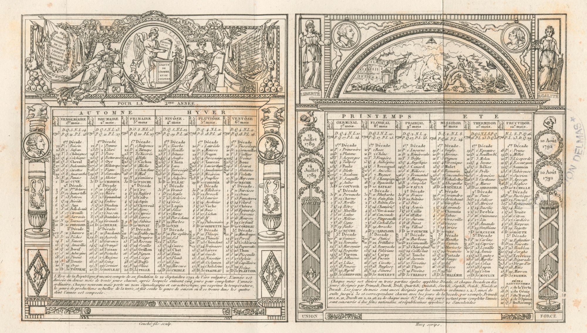 L’une des réformes les plus connues de la déchristianisation est l’adoption d’un calendrier républicain le 6 octobre 1793. Ce nouveau calendrier est élaboré par le mathématicien-astronome Romme, député du Puy-de-Dôme, et le poète Fabre d'Eglantine, député de Paris. Au-delà des noms des mois, qui rappellent les travaux des champs et les saisons, comme vendémiaire pour les vendanges, ou nivôse pour la neige, c'est l'ensemble du découpage du temps qui est réorganisé. L'année durera douze mois, eux-mêmes divisés en trois décades (et non plus semaines) de dix jours chacune, jours baptisés primidi (« premier jour » en latin), duodi, tridi, etc., et le dixième, décadi. Pour ajuster la longueur de l’année civile par rapport à la révolution de la Terre autour du soleil, cinq jours supplémentaires appelés sans-culottides, en hommage aux sans-culottes, sont ajoutés à la fin de l’année. Le premier jour de ce calendrier est fixé de manière rétroactive à la date où la Première République fut proclamée, soit le 22 septembre 1792.