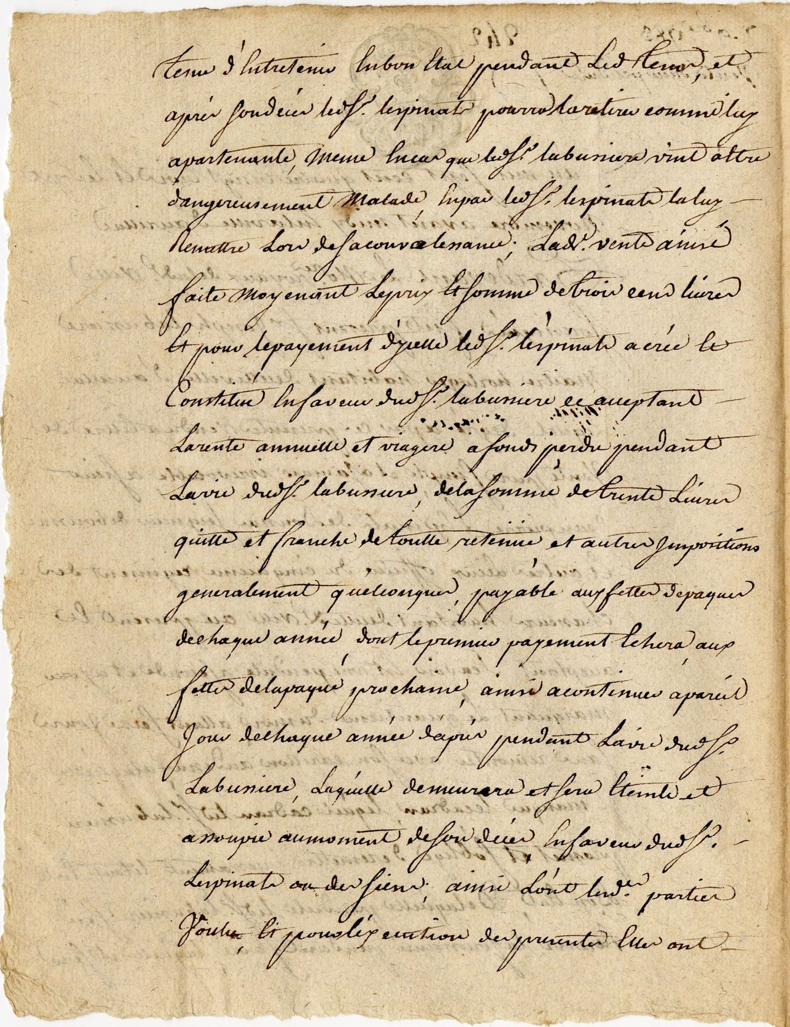 L’horloge est estimée à la somme de 300 livres (prix équivalent à deux bœufs), payables par tranche de trente livres à chaque fête de Pâques jusqu’au décès de Joseph Labussière, que celui-ci intervienne dans un délai inférieur ou supérieur à dix ans. Comme pour tout viager, l’acheteur prend donc le risque de payer l’objet de ses désirs extrêmement cher si la vie de l’horloger devait se prolonger. Toutefois, Jean-Pierre Lespinats semble avide de posséder cette pendule car il fait introduire une clause particulière dans le contrat : « en cas que ledit sieur Labussière vint à être dangereusement malade », l’acheteur pourra se saisir de l’horloge et ne la restituera que lors de la convalescence de l’horloger !