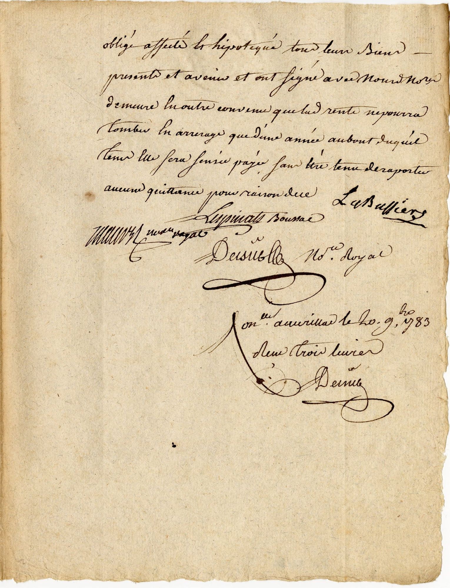 En cette année 1783, sans doute Joseph Labussière a-t-il besoin d’argent. Il va alors trouver un moyen de se constituer un revenu : vendre sa magnifique horloge… en viager. L’heureux acheteur se nomme Jean-Pierre Lespinats de Boussac, seigneur de Boussac à Saint-Simon, officier du cinquième régiment des chasseurs. Bien que la vente passée devant notaire le 7 novembre soit « pure, simple et à jamais irrévocable », l’acheteur accorde à l’actuel propriétaire la jouissance de la pendule contre bons soins pendant sa vie entière. L’horloge n’est pas neuve car il est précisé que, bien qu’elle soit en bon état, le cadran est manquant. L’artisan s’engage à le réparer avant son décès.