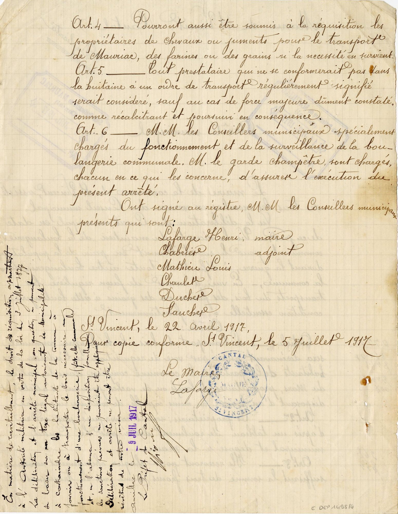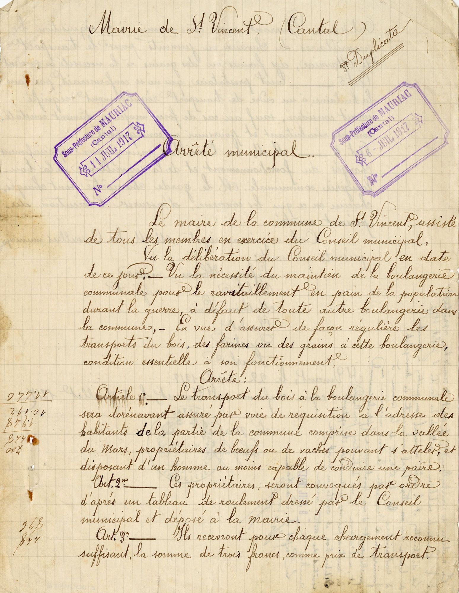 Ainsi encadrée juridiquement, la boulangerie va, si ce n’est prospérer, du moins répondre aux besoins primordiaux des habitants jusqu’en 1917. A cette date, il est à supposer que la plupart des hommes sont partis sur le Front et que de nombreux animaux ont été réquisitionnés par l’armée. Les quelques habitants d’astreinte se sont sans doute lassés de jouer les convoyeurs de bûches et se mettent en grève, au grand dam du conseil municipal qui décide d’asséner son autorité par un nouvel arrêté le 22 avril, exposé ici. Celui-ci réitère la réquisition des propriétaires de bœufs pour transporter le bois selon un planning affiché en mairie, ajoute que les propriétaires de chevaux pourront quant à eux être sollicités pour aller chercher de la farine à Mauriac, et prévoit des conséquences pour les récalcitrants. Cet arrêté est soutenu par le sous-préfet qui s’y dit très favorable, la boulangerie étant fermée et son « fonctionnement se trouvant gravement compromis par le mauvais vouloir d’habitants possesseurs de vaches qui se refusent systématiquement de transporter le bois nécessaire ».