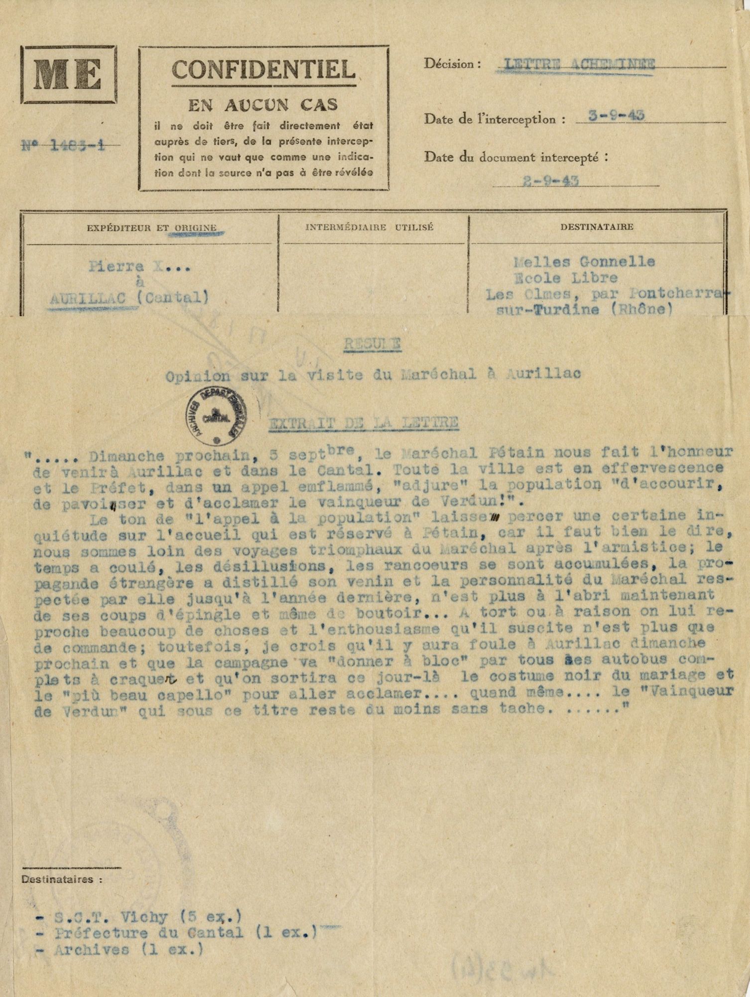 Malgré tous ces appels, la population cantalienne reste peu enjouée à recevoir le Maréchal. Le contrôle postal relève sur 295 allusions à la visite que 130 sont enthousiastes, 146 indifférentes, 15 redoutent de la tiédeur et 4 se montrent hostiles.