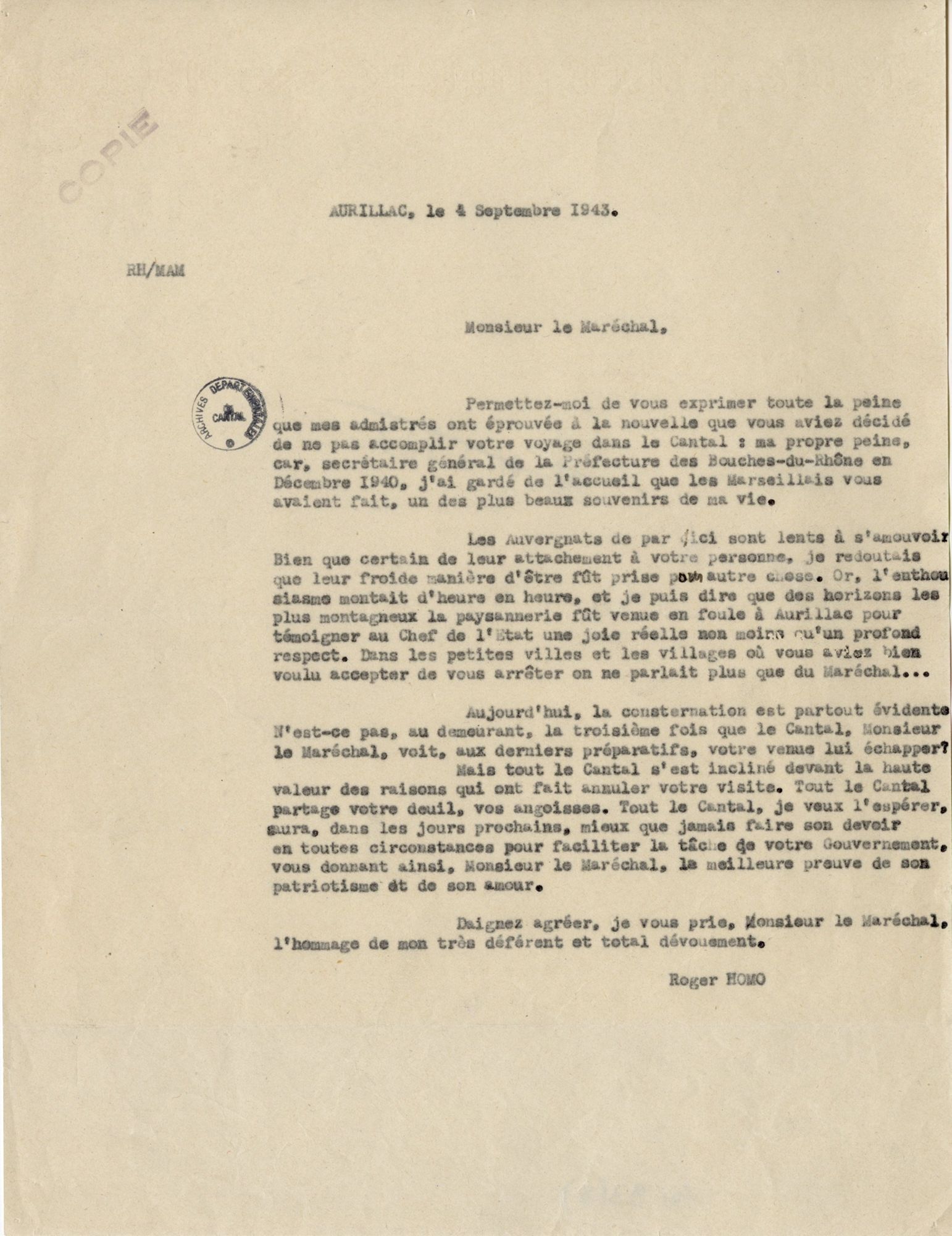 Le 4 septembre 1943, le préfet Homo adresse au Maréchal sa peine et, malgré tout celle de ses administrés après l’annulation du voyage, lui rappelant que c’est la troisième fois que le chef de l’Etat reporte sa visite dans le Cantal.