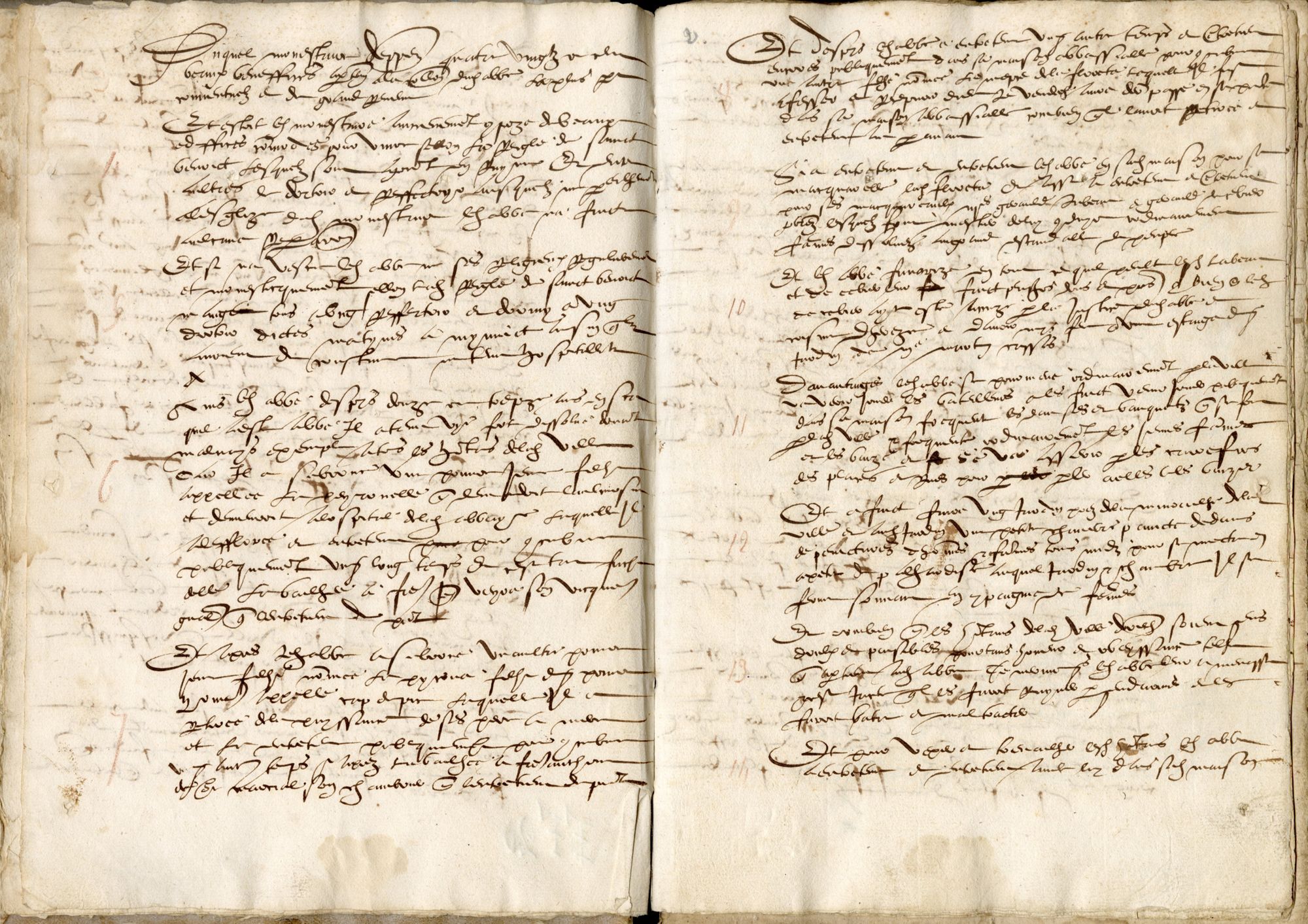 Comme peut le laisser supposer ce nombre important de folios, les accusations sont graves et nombreuses. L’instruction est confiée à Me Jean de Rivo, lieutenant général du juge ordinaire de la vicomté du Carladès, et dès le premier folio, il est dit que « Et si n’a vescu ledict abbé ne ses religieux regulièrement et monesticquement sellon la reigle de sainct Benoict, mangé tous à ung reffectoir et dormy à ung dortoir, dites matynes à minuict ainsin qu’ils avoient de coustume ». Il est reproché aux moines de ne plus suivre la règle monastique, en particulier la règle de saint Benoît, à laquelle ils sont astreints de par leur ordre. Ils ne vivent plus en communauté et ne disent plus les prières, ce qui est l’essence même de la vie monastique. Encore ne s’agit-il là que des faits les plus minimes. D’après Hervé Miraton[2]qui a étudié ce texte : « les choses ne font qu’empirer dans les folios suivants avec des scènes où la violence fait concurrence au stupre et à la lucre ». Il en retient trois accusations principales.