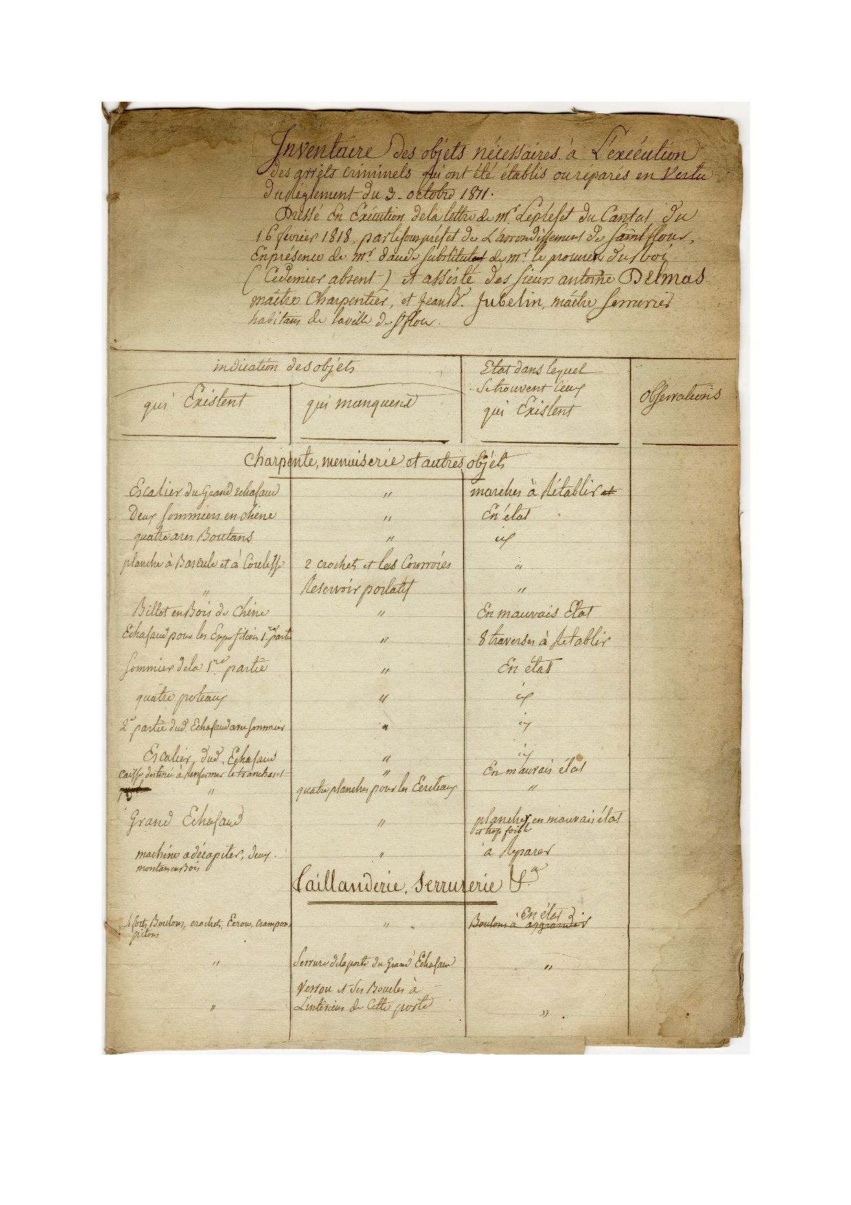L’article 7 du nouveau règlement prescrit que « les préfets feront dresser un devis estimatif des instruments ». A cet effet, le sous-préfet de Saint-Flour commissionne, Antoine Delmas, maitre charpentier, et Jean Valadier, maitre serrurier. Charge à eux d’établir un devis estimatif des réparations nécessaires et des transformations permettant à ces instruments de « pouvoir être transportés et placés partout où il y aura lieu ». A la lecture du devis, le tout, bien que régulièrement utilisé[3], semble en très mauvais état : « l’escalier extérieur par lequel on monte sur l’échafaud doit être refait à neuf », « cet échafaud dont la superficie est de 48 mètres quarrés a besoin d’être remanié en entier », « la planche à bascule où le condamné est attaché doit être refaite à neuf avec coulisse » et « que n’y ayant point de billot, il doit être établi un en bois de chêne ». Quant à l’échafaud pour les expositions « il n’en existe pas ». Les artisans préconisent d’en construire deux, chacun pouvant « y exposer deux personnes, en y adaptant deux poteaux avec carcan à boulon, écrou, chaine et cadenas ». Ils notent cependant que « les fers pour les flétrissures existent pour avoir été faits nouvellement ». Toutefois, « il manque le réchaud, les pèles, pincettes et soufflets exigés par le règlement ». En 1818, un nouvel inventaire est prescrit par le préfet. L’état du grand échafaud laisse toujours à désirer : l’escalier est à rétablir et le plancher en mauvais état. La machine à décapiter est aussi à réparer. En revanche, le petit échafaud a été construit et il est jugé en état. Le billot en bois de chêne n’est plus manquant mais en mauvais état. Quant aux réchauds, pelles et soufflets, ils sont toujours manquants. Ceci expliquant cela, une note fait observer que « les objets désignés dans le présent inventaire sont tout bonnement placés sous un angar dressé au milieu des décombres d’une ancienne maison détruite appartenant à la ville, laquelle n’a qu’une mauvaise toiture et ne peut préserver des injures et des dégradations du mauvais temps ».