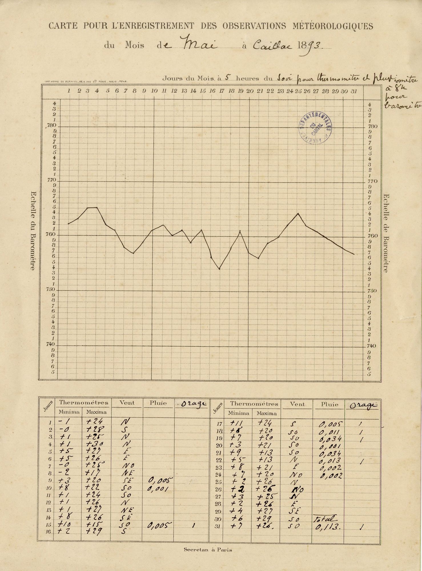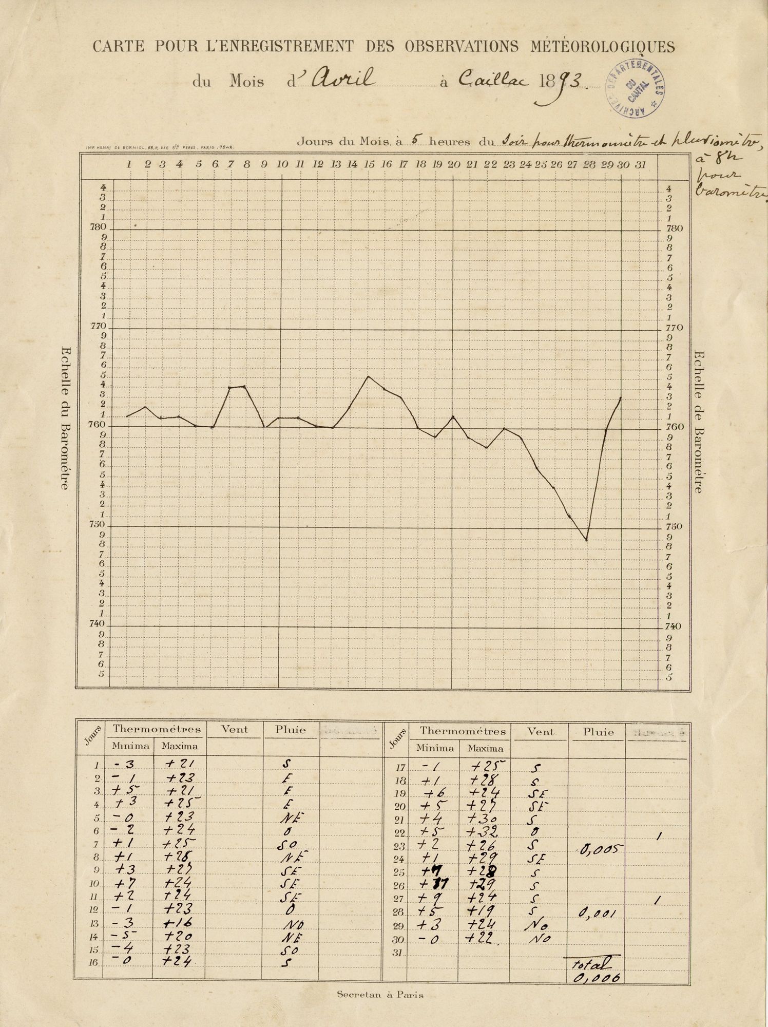 Cette année-là, la sécheresse frappe durement le Cantal dès le printemps. Le 27 avril 1893, Le Moniteur du Cantal, s’en fait l’écho : « La campagne souffre cruellement de la sécheresse prolongée et l’inquiétude augmente tous les jours. Voici, en effet soixante jours que la pluie n’est pas tombée. [...] la période exceptionnelle de sécheresse que nous traversons n’a pas d’exemple dans nos régions depuis qu’on recueille régulièrement les observations météorologiques »[1]. Les Archives du Cantal conservent un témoignage précieux de cet épisode : les relevés météorologiques effectués par Pierre Marty, célèbre naturaliste et botaniste cantalien. Ce véritable, touche-à-tout, à la fois poète, peintre, dessinateur, photographe, naturaliste ou archéologue, s’est aussi intéressé à la météorologie. C’est ainsi qu’il effectue régulièrement des relevés, chez lui au château de Caillac (commune de Vézac), pour le compte de la commission météorologique départementale. Par chance, les cartes pour l’enregistrement des observations des mois d’avril et mai 1893 ont été conservées[2]. Pour le mois d’avril, il ne relève que deux jours de précipitations avec un total pluviométrique plus que faible de 0,006 exprimé en mètre soit 6 mm. Heureusement, grâce à plusieurs épisodes orageux, le mois de mai est nettement plus arrosé avec un total 113 mm. En comparaison, les données météos pour Aurillac entre 1981 et 2010, donnent des précipitations moyennes de 115,5 mm pour le mois d’avril et de 118,4 mm pour le mois de mai, qui sont communément les deux mois les plus pluvieux de l’année[3]. Les records de sécheresse sur cette période sont de 14,9 mm pour les mois d’avril 1982 et de 32,8 mm pour le mois de mai 1991. Le mois de mai 1893 est certes proche des moyennes de saison mais il ne suffit pas à rattraper un mois d’avril exceptionnellement sec et chaud.
