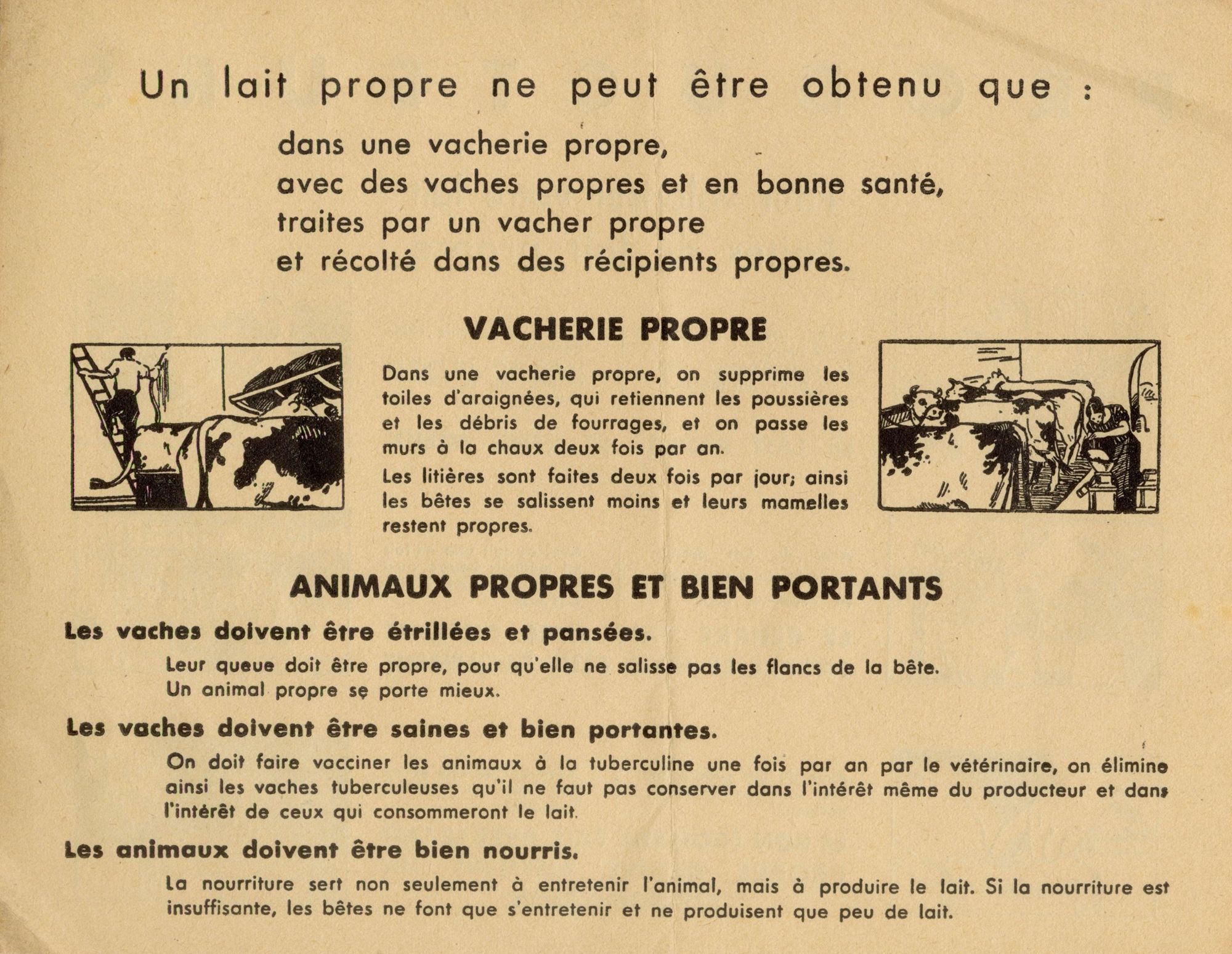 Paradoxalement, il n’est ici nullement question de santé publique, la plaquette présentant l’amélioration de la qualité du lait sous l’angle du développement économique de la filière et, surtout, de profits à espérer. Il est en effet rappelé aux producteurs que « le lait sale compromet à la ville la consommation du lait, du beurre, du fromage » tandis qu’un « lait propre garnira votre porte-monnaie » !