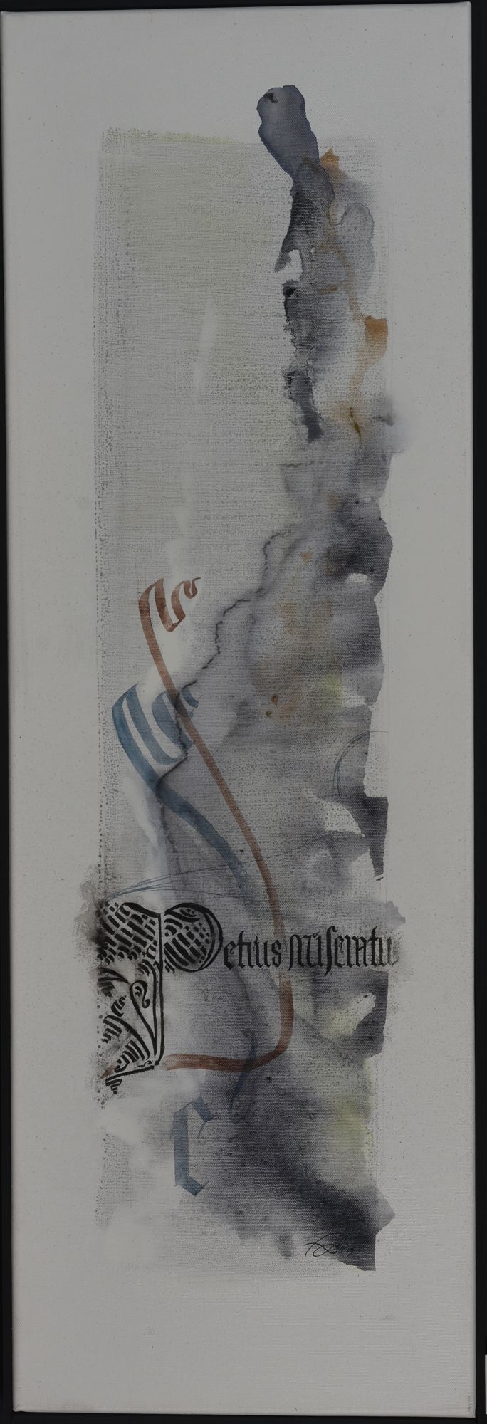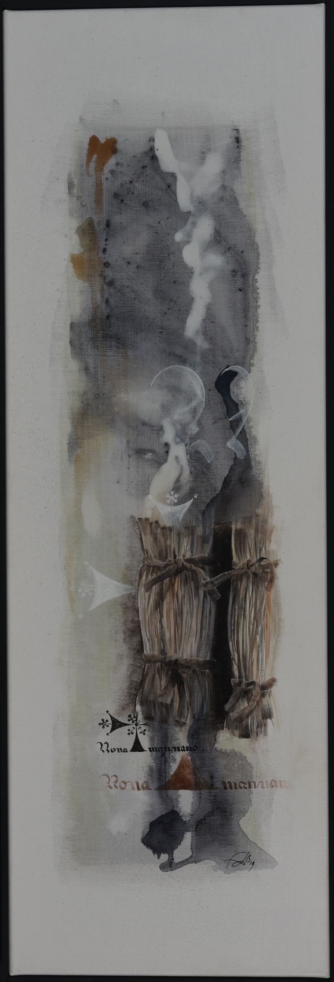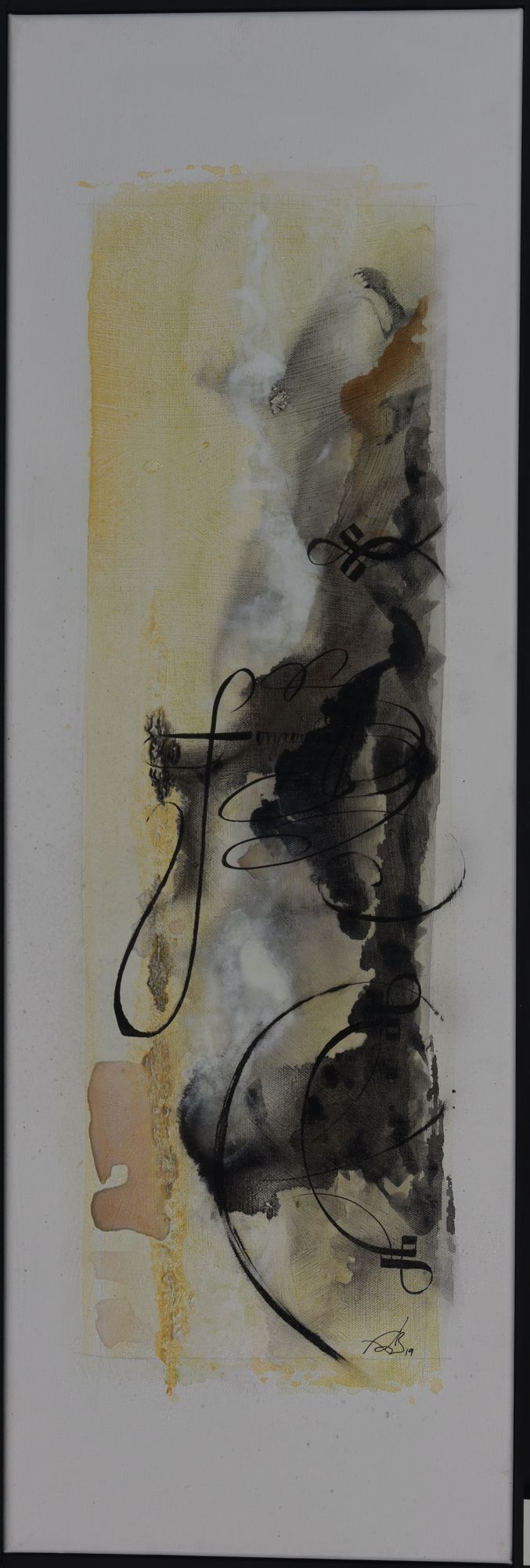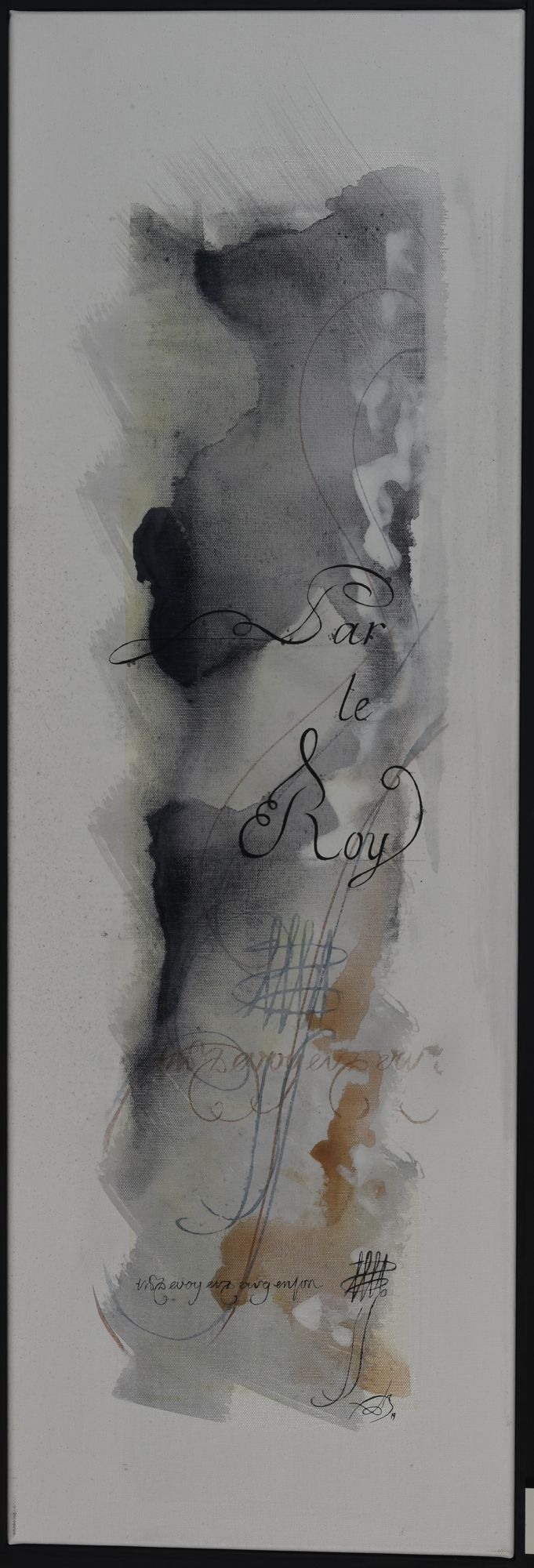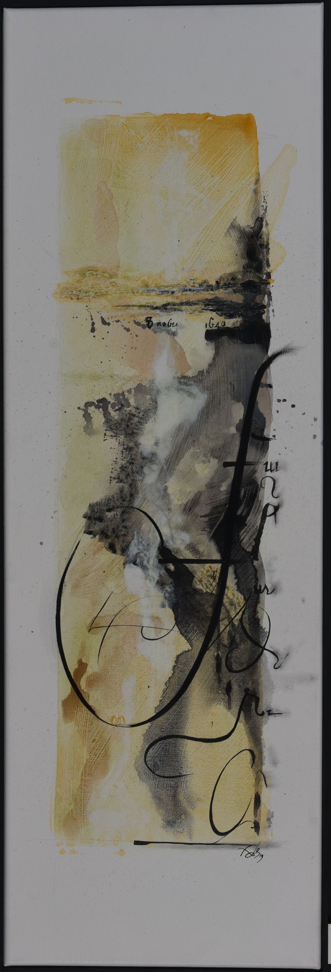 Pour ce projet d’exposition aux Archives départementale, elle compose avec les deux, figuratif et abstrait. Séduite par la calligraphie, art auquel elle ne s’était jamais confrontée, FabB s’est laissée imprégner du sujet pendant de longs mois avant de tenter de retrouver le geste de nos ancêtres. Les quinze toiles sont toutes peintes à l’acrylique, avec une technique d’aquarelle pour les fonds.