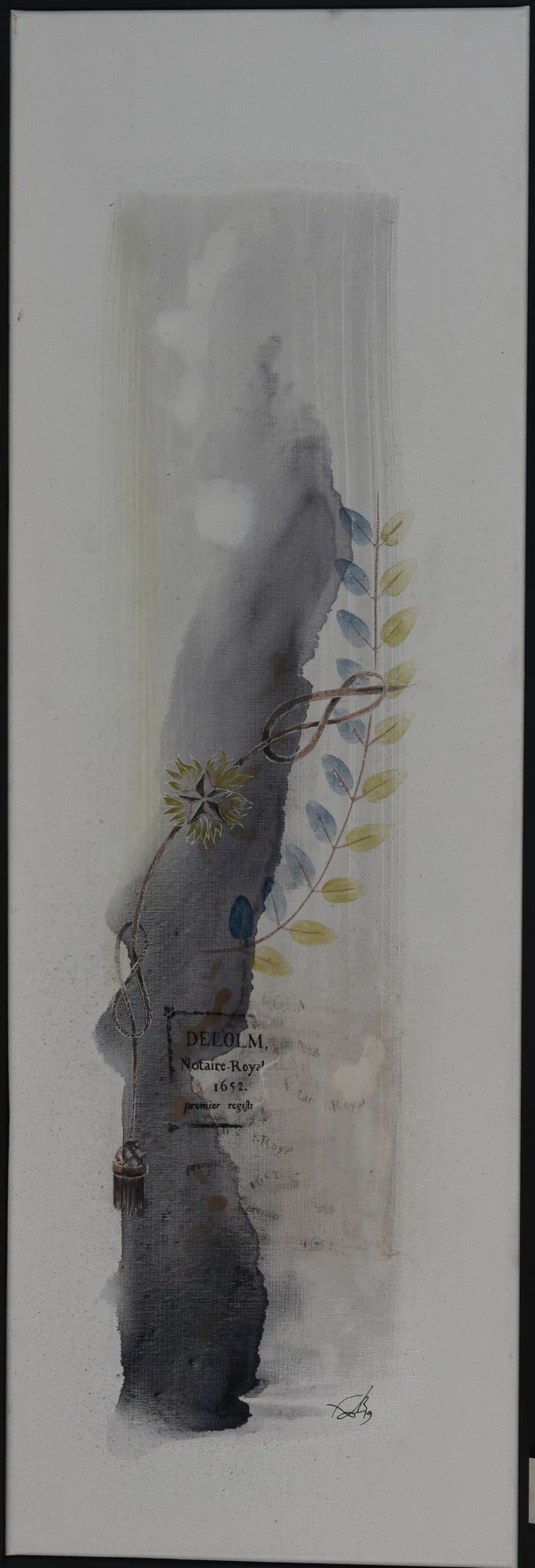 C’est ce geste, délié, envoûtant, qui a séduit FabB au point de s’imposer à son pinceau. Fascinée par ces courbes, elle a accepté la carte blanche que lui ont offerte les Archives : reproduire sur toiles sa découverte des documents. Les travées de registres dans les magasins, les initiales exubérantes des minutes notariales, les chiffres d’une date, les clous sur la couverture d’un ouvrage, mais aussi les décors d’insignes maçonniques ou l’étoile d’un blason : dans ses tableaux se mêlent et s’entremêlent, comme dans un rêve, les images à l’identique ou refaçonnées d’époques et de lieux divers. Dans ses tableaux se subliment les détails à l’origine purement administratifs ou fonctionnels en un doux éloge de ce qui fonde l’acte comme l’art : le geste du créateur.