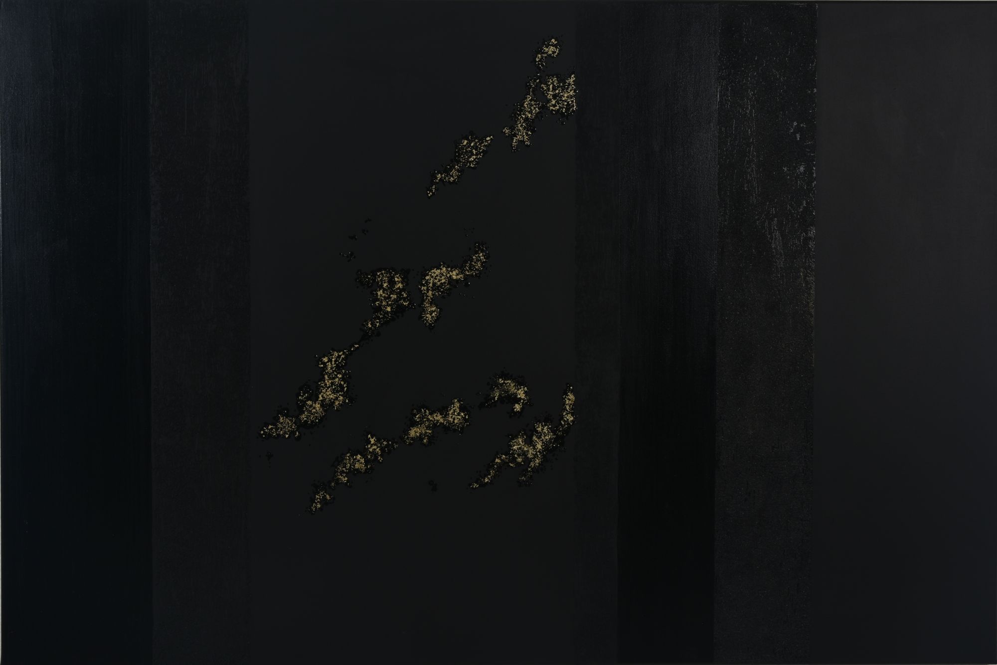 A la suite de la série « Authentique » se trouvent quatre tableaux réalisés pour l’occasion mais dans la continuité d’un projet commencé il y a quatre ans, une autre exposition intitulée « Le noir est une couleur ». Une longue série de tableaux grand format, mêlant différentes techniques, a vu le jour depuis que l’idée a germé dans l’esprit de FabB de momentanément laisser de côté la couleur et de ne travailler que le noir, réduit à des textures, des brillances, des mats. Impossible bien sûr de nier l’héritage de Pierre Soulages. Mais loin de toute copie, FabB crée son propre cheminement, fabrique ses propres textures et joint à la peinture acrylique de la résine, parfois du tissu, souvent de la feuille d’or. Les reliefs, minuscules rugosités ou crevasses plus tranchées, déclinent le noir sous toutes ses nuances, puis laissent la place à un effet de miroir qui tour à tour s’abîme sur lui-même et resplendit. Les poussières d’or s’étirent, se cachent, s’enlisent ou s’envolent, tandis que les textures ponctuent leurs élans. Approchez-vous : la lumière se déplace elle aussi et fait jouer ombres et reflets. Le tableau s’anime, il devient vivant.