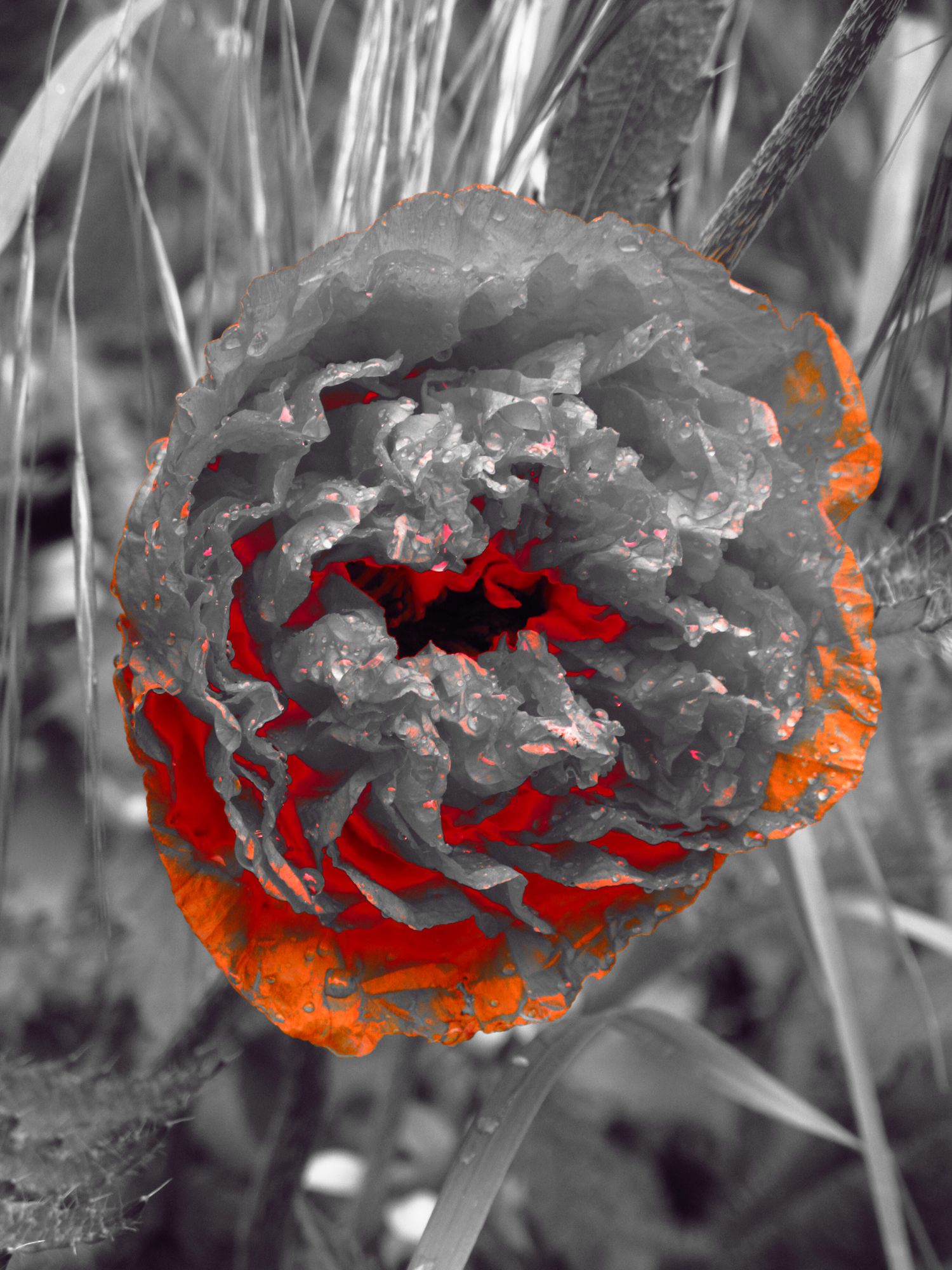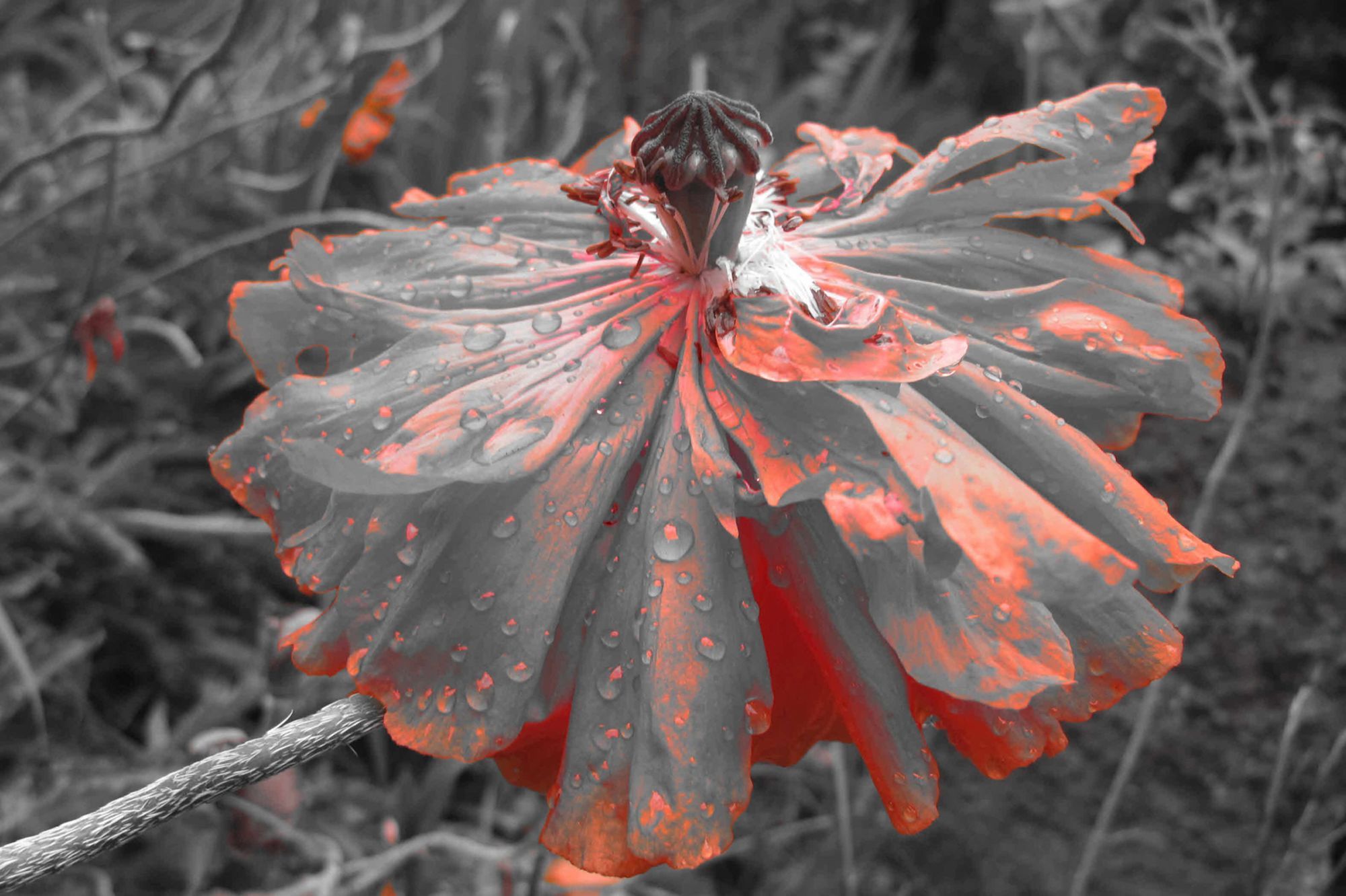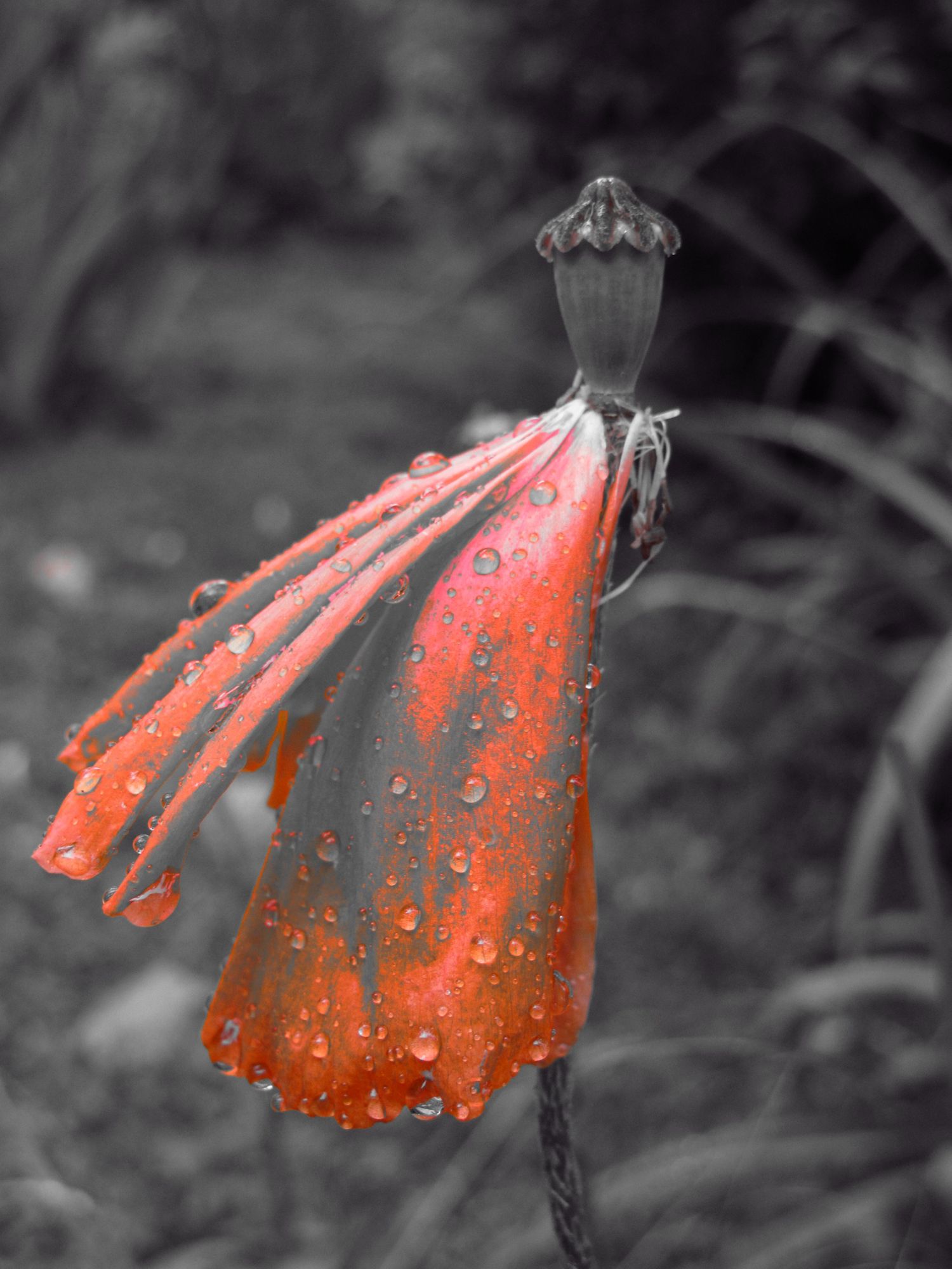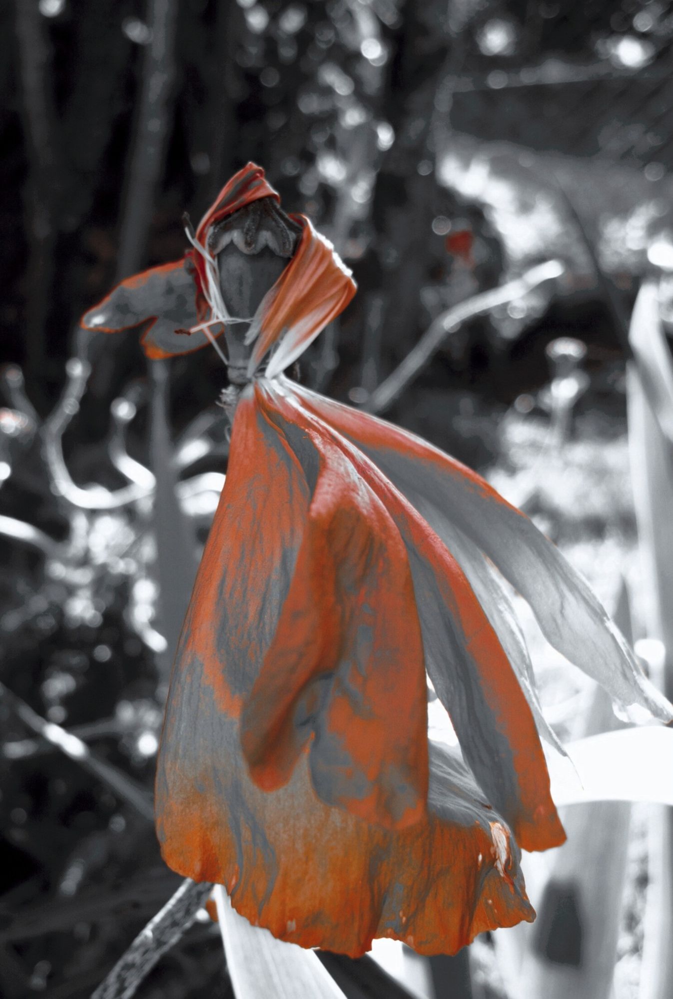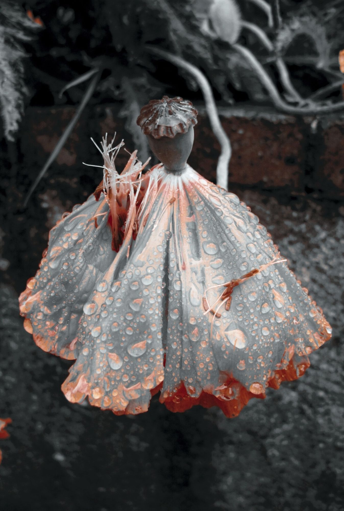 Gilbert Delrieu est un photographe de l’imaginaire. A l’instar d’un héros de mythe, simple mortel ayant surpris au détour d’une clairière nymphes ou farfadets inconscients de sa présence, il a saisi sur le vif les marionnettes qui s’égayaient dans son jardin, après la pluie. Suite à une grosse averse, raconte-t-il, il aurait découvert ses coquelicots tout juste éclos en piteux état, malmenés par le mauvais temps et tristement dépourvus de leur fière corolle. Toutefois, il ne lui aura fallu qu’un coup d’œil pour découvrir, sous cette façade désolée, le monde merveilleux qui prenait vie. Juchés sur leur tige, les pistils devinrent subitement de petites têtes couronnées, vêtues de robes, capes et autres habits de fête, apparaissant au gré des avaries du vent les uns mélancoliques, les autres enjoués, d’autres encore pris dans un jeu de séduction. Chacun affiche sa personnalité, chacun raconte son histoire, pour peu que l’on écoute son imagination.