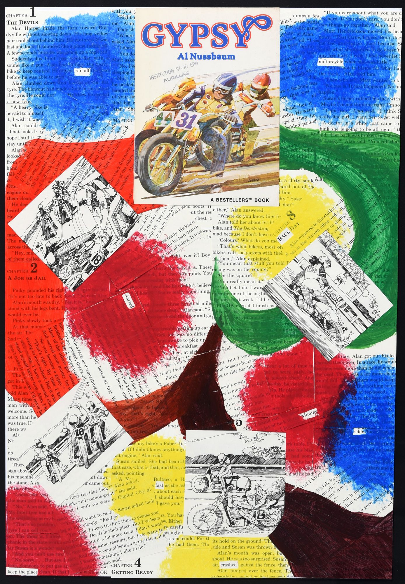 Telles les traces laissées sur le sol par le dérapage des deux-roues, des plages colorées circulaires viennent créer un dialogue avec des mots de l’histoire.