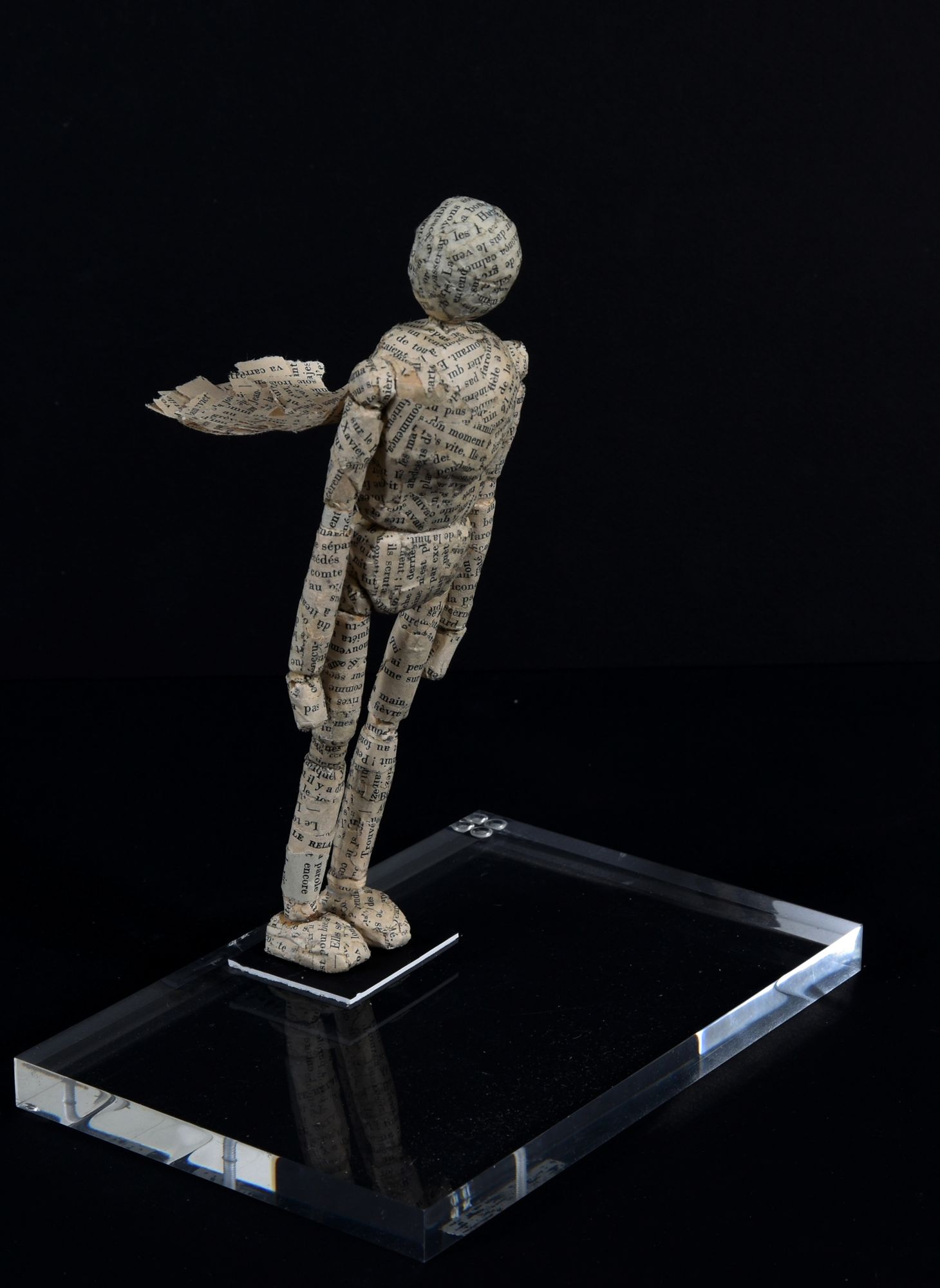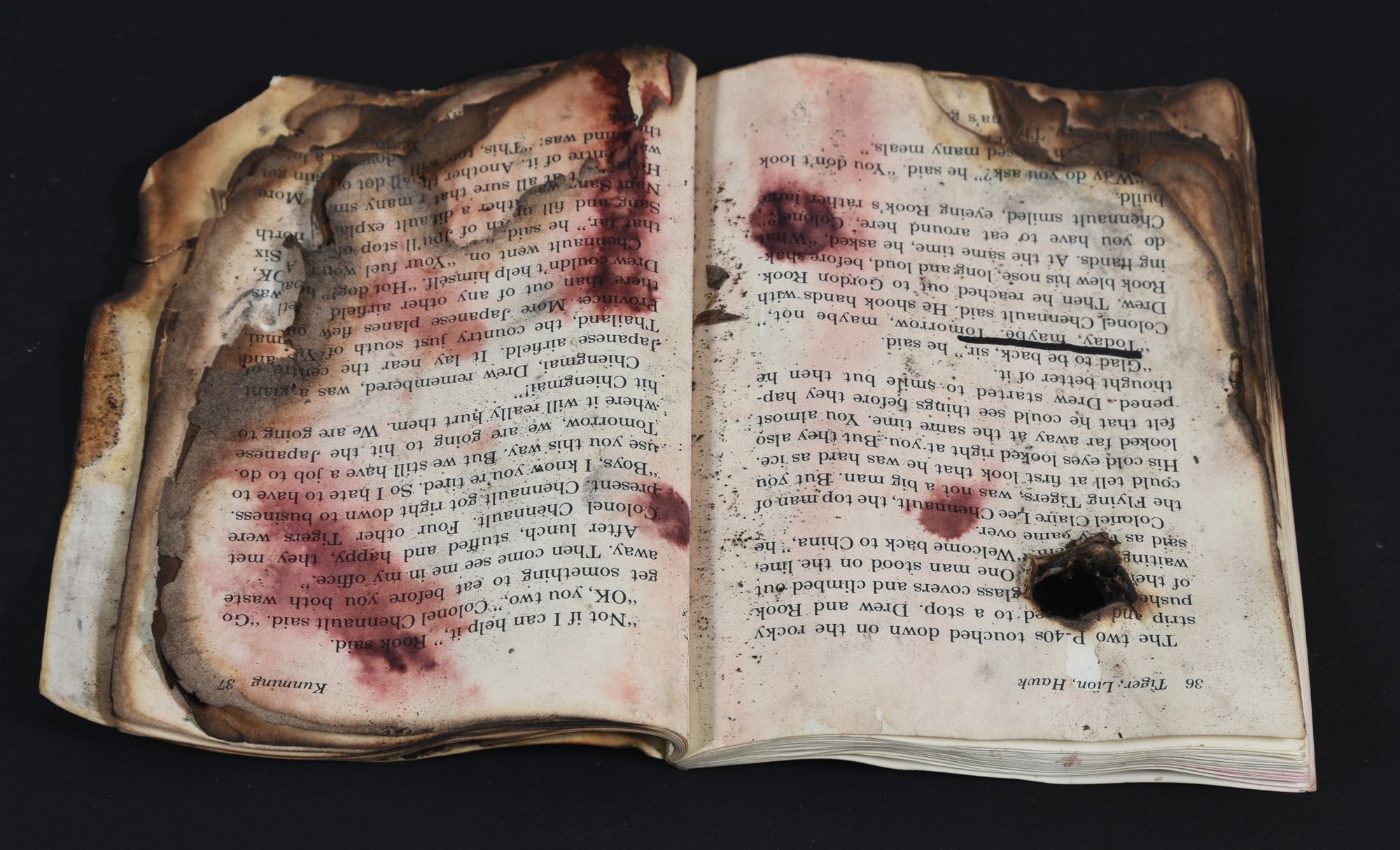 Le corps abattu de cet homme reste figé au creux du livre alors que son âme, ici symbolisée par le découpage des pages, le quitte.
