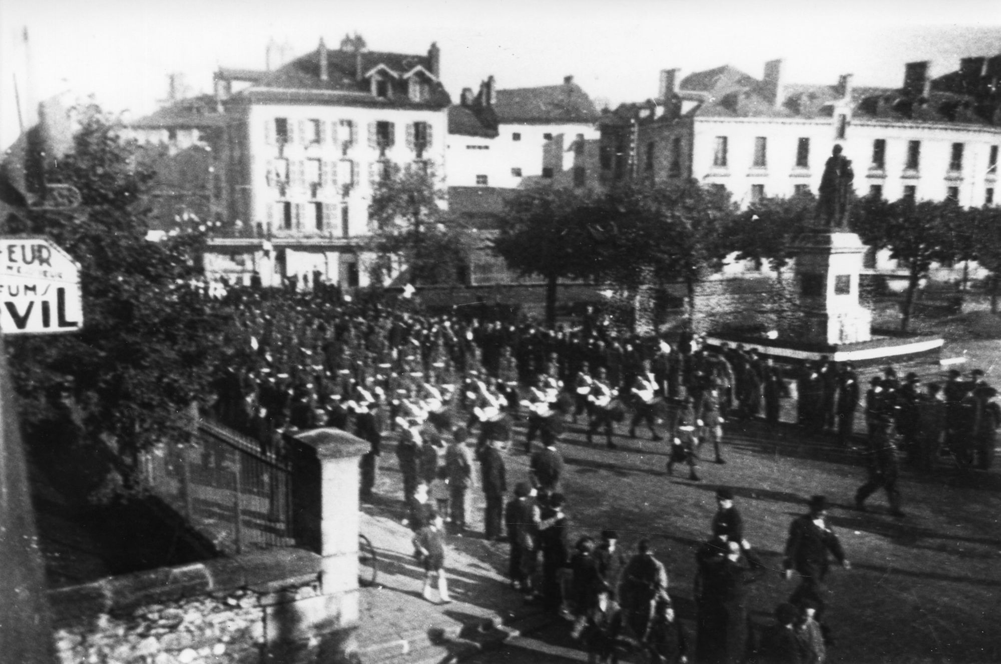 Défilé sur la place du Square à Aurillac, probablement lors de la visite du général de la Porte du Theil. La foule s’est alignée pour les regarder passer.