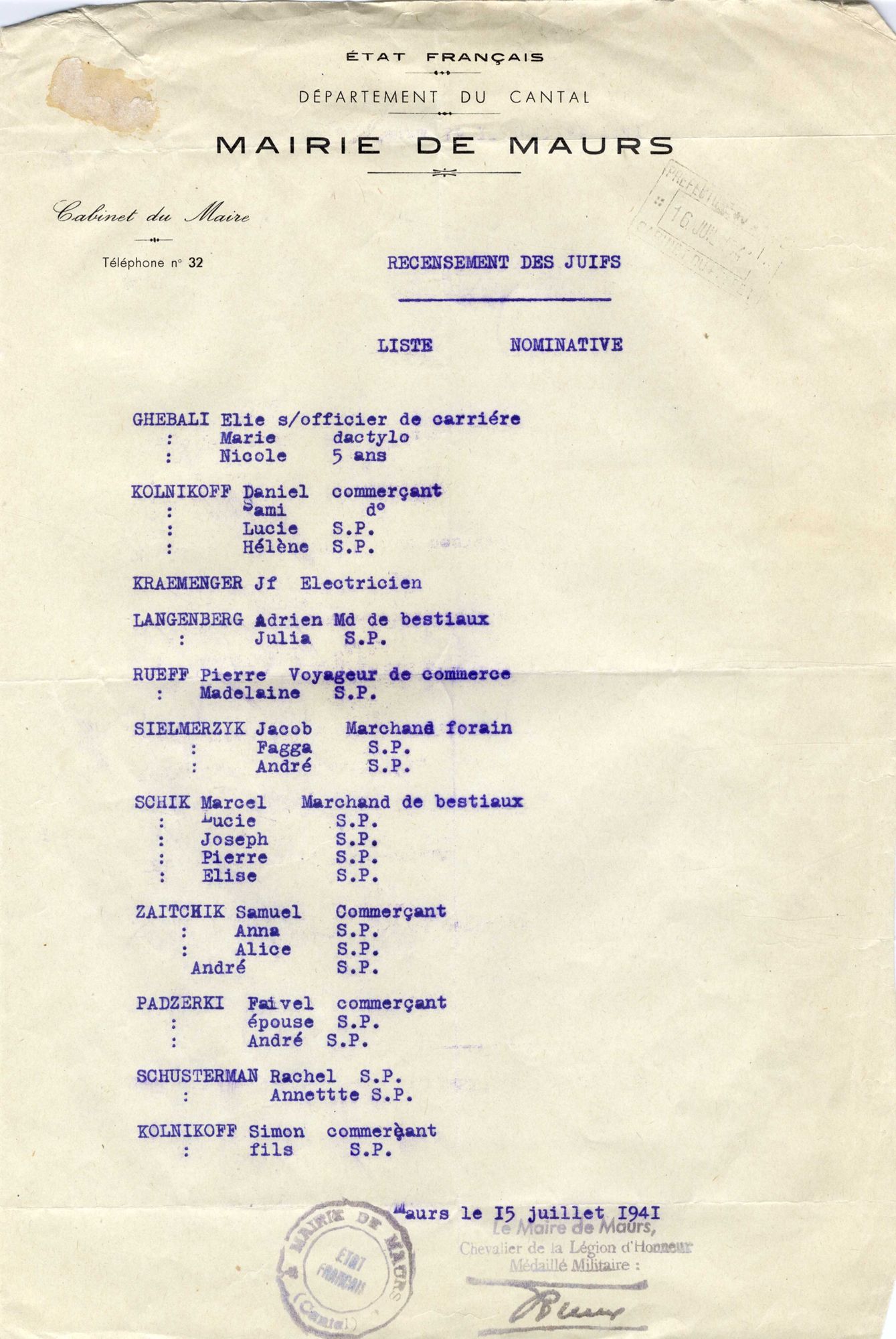 Tous les maires doivent adresser à la préfecture la liste des juifs français et étrangers résidant dans leur commune. Le préfet du Cantal transmet à Vichy un premier résultat du recensement des juifs dans son département le 4 juillet 1941 : 207 juifs français et 167 juifs étrangers. Mais le 25 septembre 1941, une rectification portait les chiffres à 248 juifs français et 240 étrangers. Un certain nombre avait échappé au recensement soit en se cachant, soit grâce à la complicité de quelques maires.