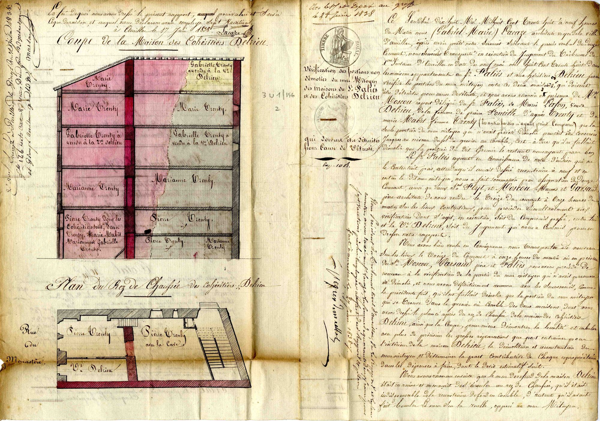 Gabriel Marie Lacaze, architecte voyer de la ville, dresse la coupe d’une maison réputée insalubre de la rue du Monastère à Aurillac, dont l’arrière donne sur le jardin du collège. En calculant « avec plus de précision les grosses réparations que peut entrainer pour l’intérieur de la maison Delrieu la démolition et reconstruction du mur mitoyen et déterminer la part contributive dans les dépenses à faire », Lacaze fait le plan du rez-de-chaussée et la coupe de la maison. La partie colorée en rose est celle qui doit être refaite.