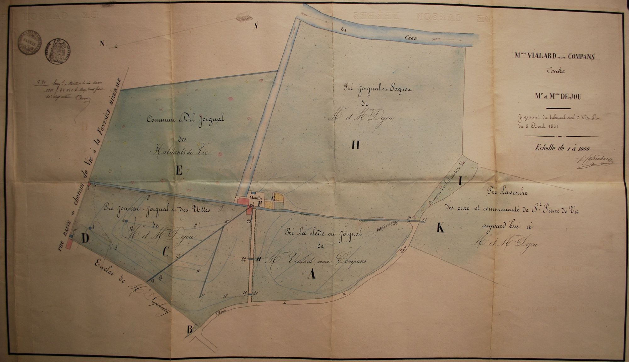 Anne Vialard, veuve de Jean-Paul Compans, possède le pré de la Clède ou Joignal (A) ; elle prétend pouvoir l’arroser en prenant, du vendredi matin au lundi matin, les eaux du pré voisin et supérieur des Uttes, appartenant à Dejou, juge de paix, et à sa femme née Daudin. Calvinhac, l’expert, relève que ces prés n’en formaient jadis qu’un seul, appartenant sous l’Ancien Régime à Pagès des Uttes (alias des Huttes), procureur du Roi au bailliage de Vic, mais qu’il a été scindé par vente en 1760. En 1761 eut lieu le partage des eaux à peu près tel que le soutient la veuve Compans. Mais les sources et les eaux ont changé, car Daudin, le père de Mme Dejou, a drainé le pré des Uttes pour alimenter un moulin à farine (F).