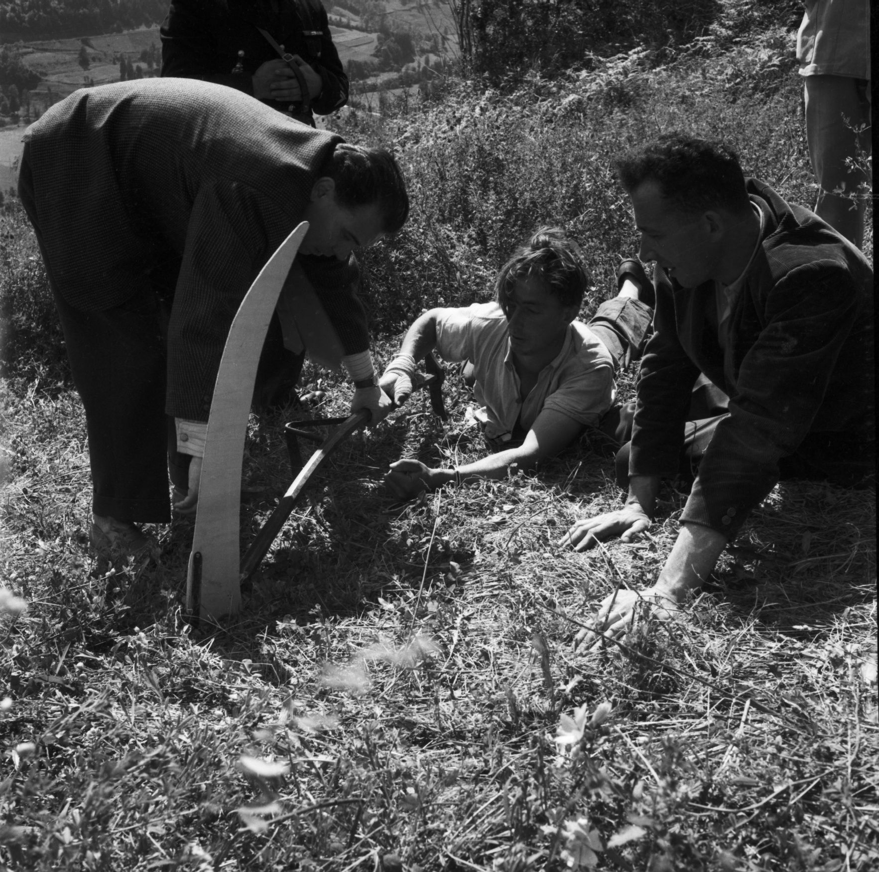 Les photographies du journal La Montagne, en cours de numérisation et de mise en ligne, en vertu d’une convention liant le Conseil général au groupe Centre-France, permettent de suivre la reconstitution dans le pré de fauche.