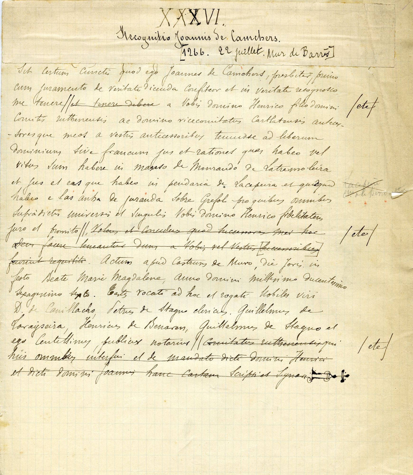 Le manuscrit montre que le texte des chartes était copié tout au long ; des corrections remplacent les formules stéréotypées, jugées non significatives, par « etc. ». Le manuscrit est ensuite composé, puis corrigé de la main des deux éditeurs : le comte de Dienne (en violet) et Gustave Saige (en sépia) ; ce dernier donne le bon à tirer (ou, plus exactement, le « bon à mettre en pages »).