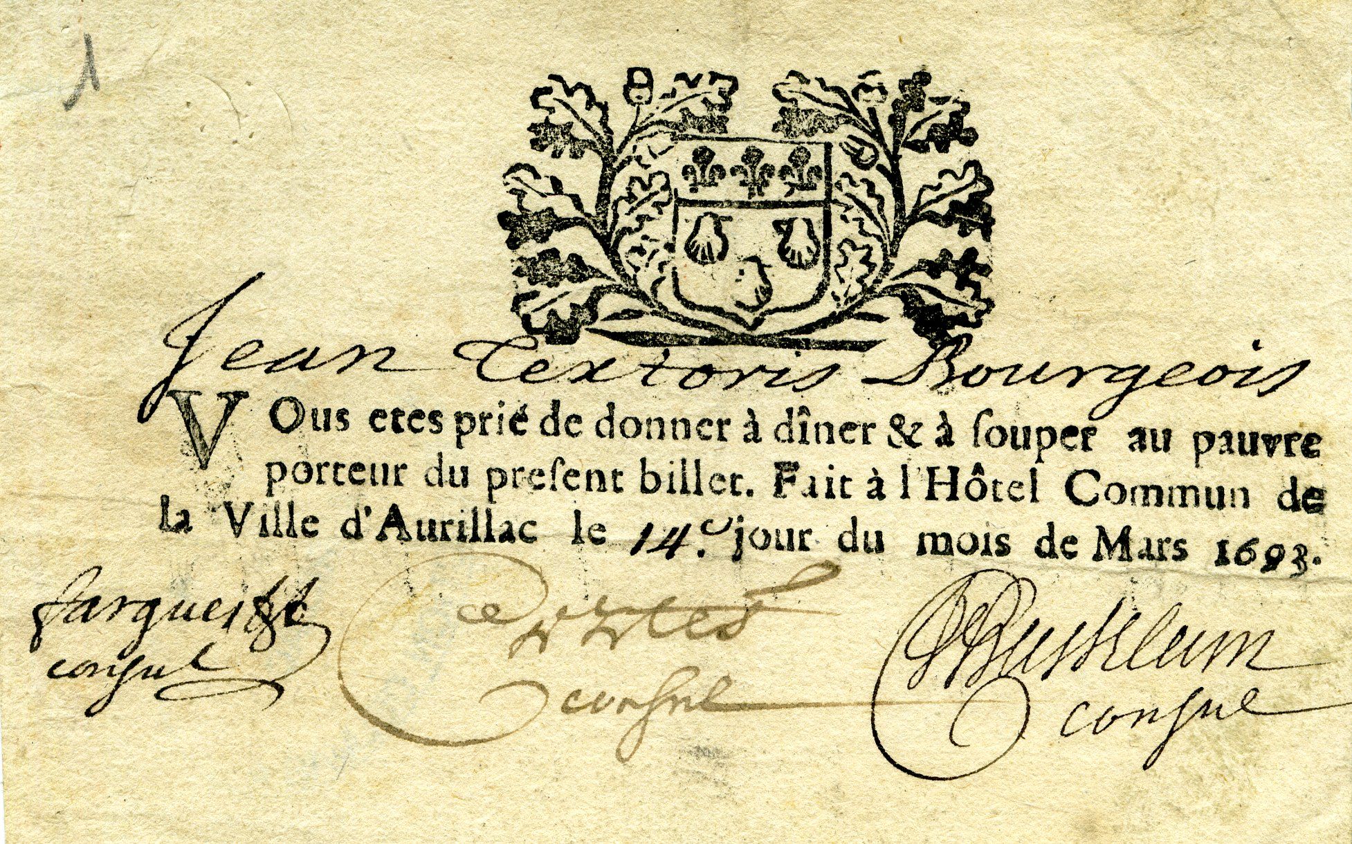 Les trois consuls d’Aurillac en charge durant l’année 1693 distribuent aux pauvres des « bons de soupe » pour leur permettre d’aller prendre des repas chez des bourgeois de la ville, comme ici Jean Textoris.
