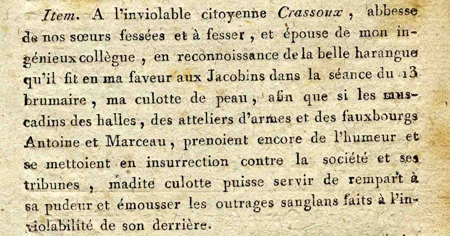 Carrier, on le sait, a brillamment appliqué ces méthodes de purge à Nantes, ce qui l’a conduit à la guillotine. Le dévoreur est dévoré à son tour, dans des sarcasmes de soulagement, comme le montrent ces Adieux de Carrier.