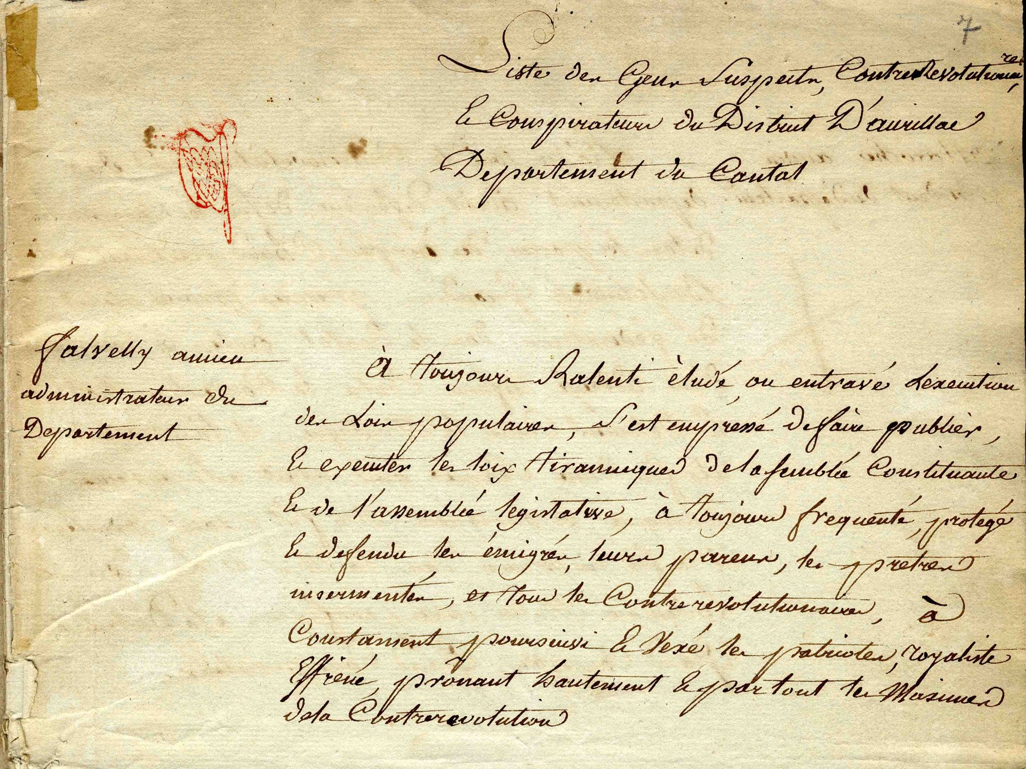 La « Liste des gens suspects, contre-révolutionnaires et conspirateurs du district d’Aurillac » a été établie le 15 prairial an II par un secrétaire pour Carrier, qui l’a annotée et signée. Elle détaille, avec un grandiloquent luxe de détails, les crimes des suppôts de la contre-révolution.
