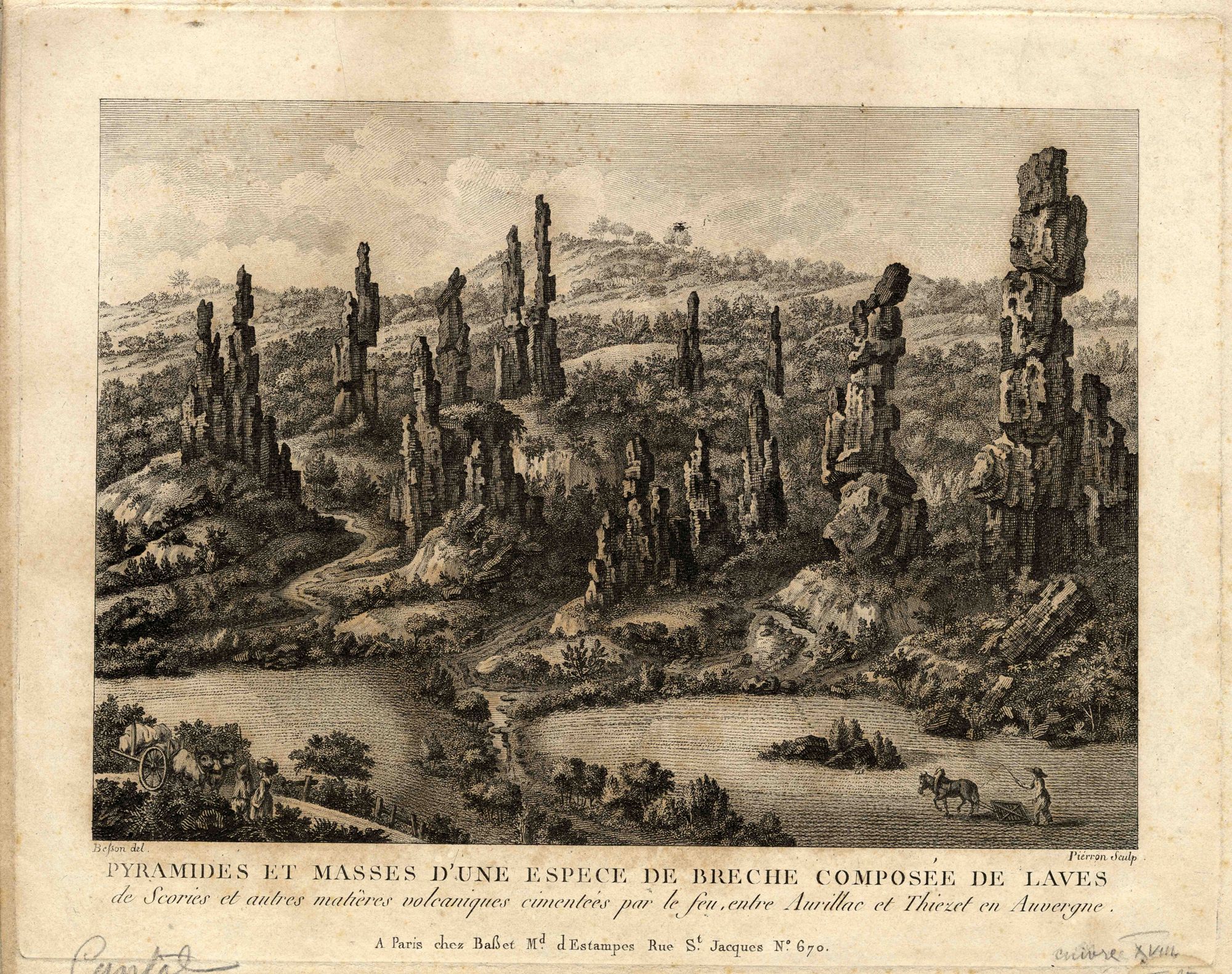Cette gravure de Pierron, d’après un dessin de Besson, représente la porte du Lion à Thiézac. Tous les promeneurs familiers de ce lieu ne reconnaîtront pas dans ces orgues vertigineuses, inquiétantes et isolées, le chaos de Casteltinet, ni dans le filet d’eau descendant de l’horizon le cours de la Cère. Ces « pyramides » donnent du paysage auvergnat une image « sauvage » et formidable.