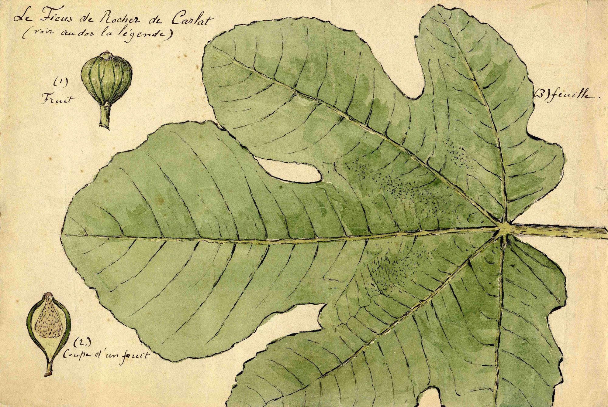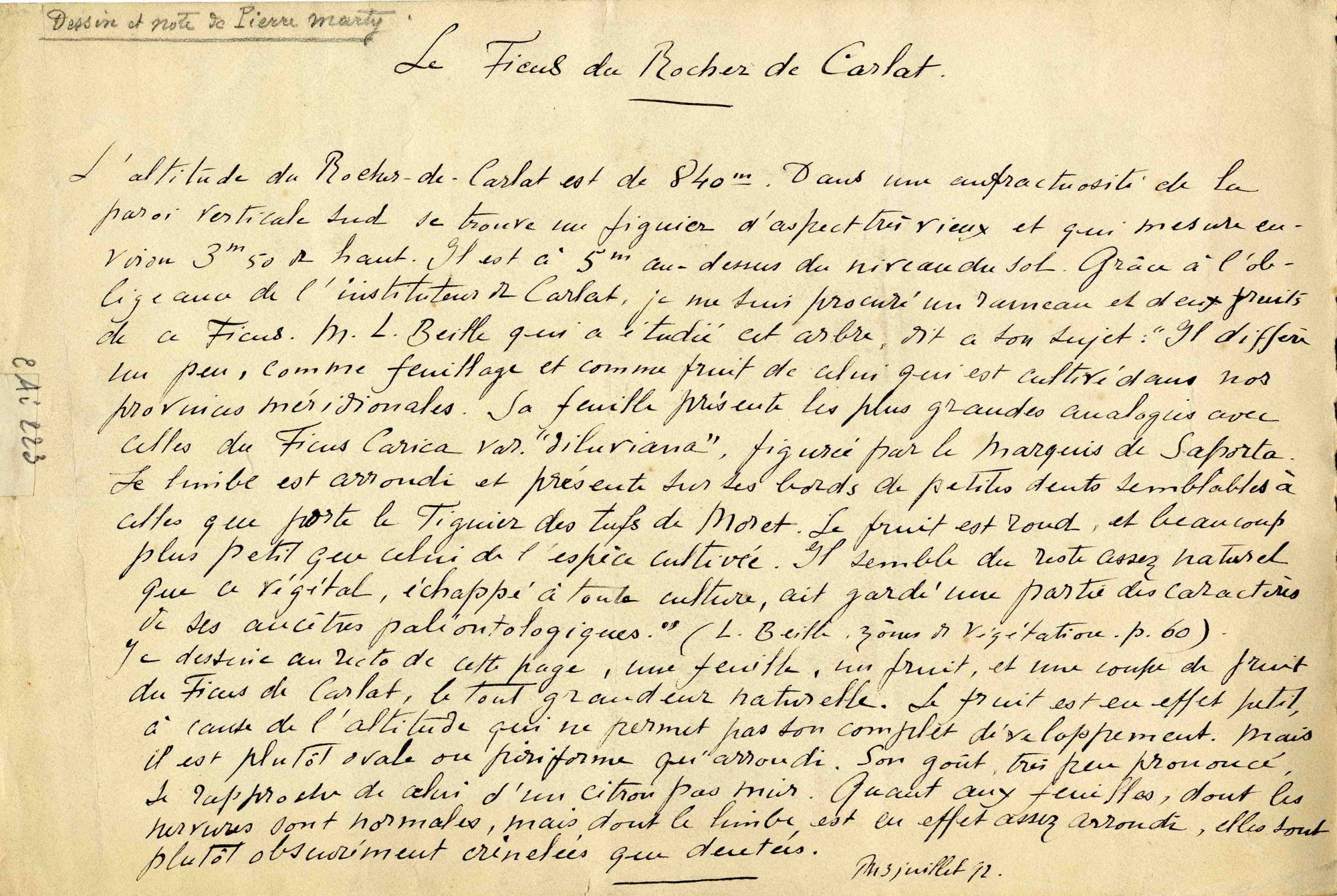Pierre Marty, en juillet 1892, dessine et peint une feuille et une figue du « figuier d’aspect très vieux » qui pousse dans une anfractuosité de la paroi verticale sud » du Rocher. Il note que cet arbre est sauvage, que son fruit est plus petit que celui des espèces méridionales gorgées de soleil.