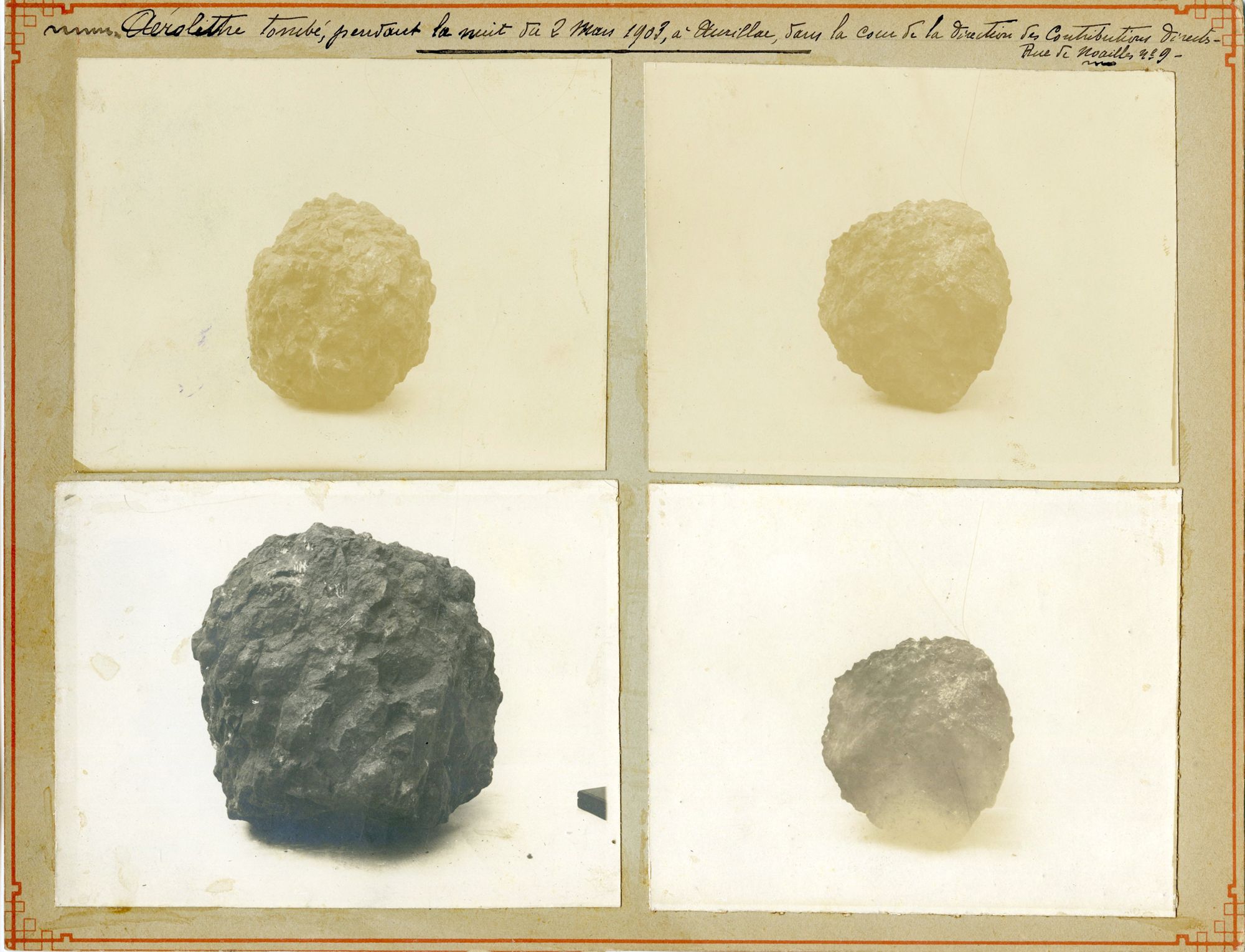 Photographies d’un aérolithe tombé dans la cour de la direction des contributions directes à Aurillac