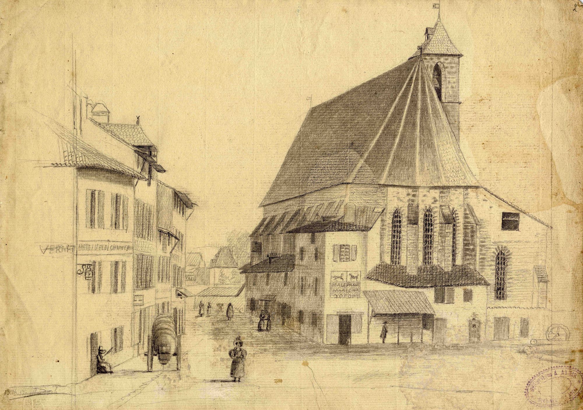 L’habillement des personnages du premier plan et surtout le clocher amènent à dater ce dessin d’avant 1847, année où fut construit le clocher. Le chevet n’était pas encore dégagé ; il comprenait des maisons d’habitation. L’actuel restaurant « L’abside » était l’atelier d’un maréchal-ferrant nommé Maleprade. La suite de la rue des Carmes avait un aspect plus champêtre qu’aujourd’hui.