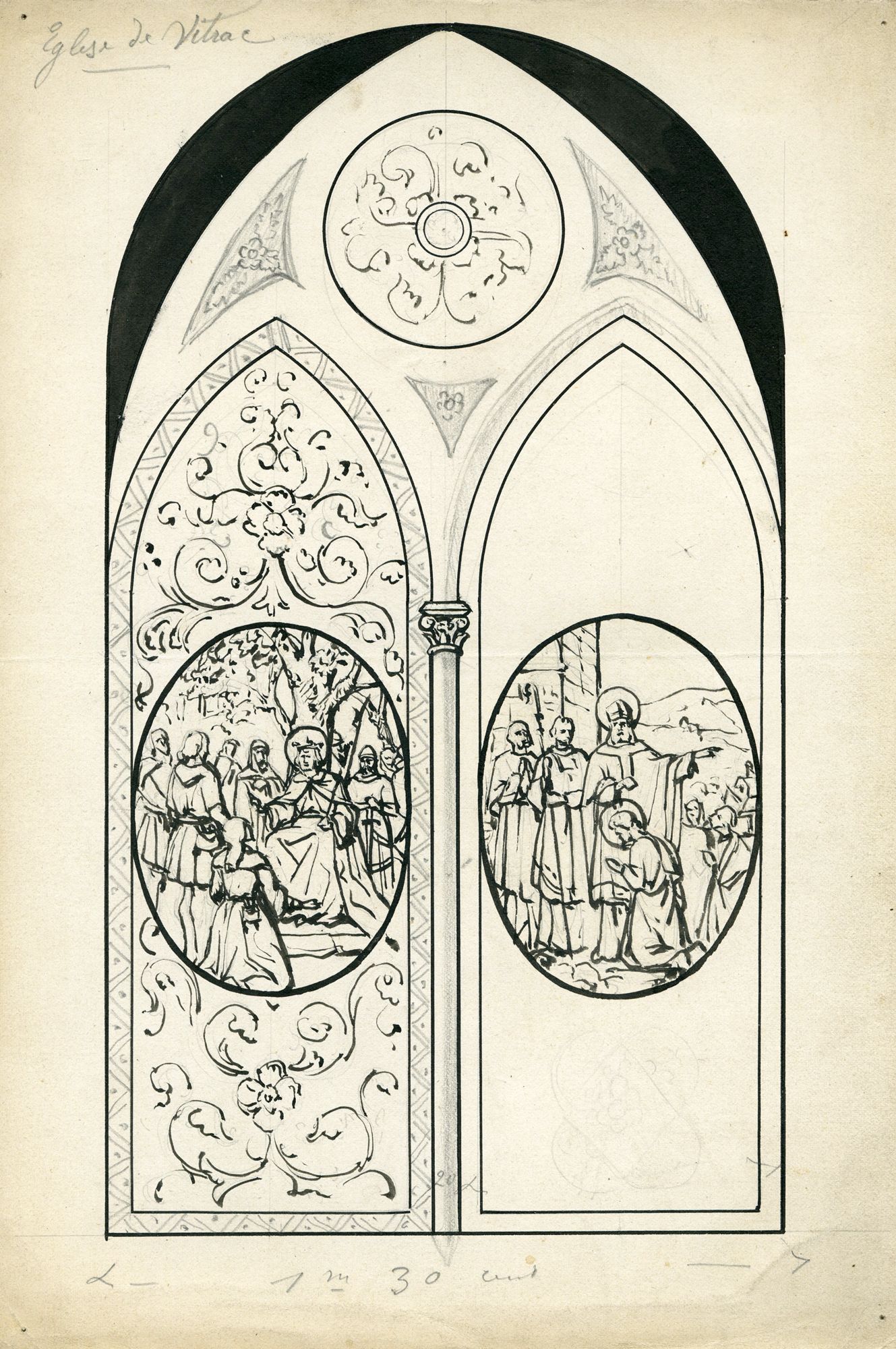 Ce dessin au crayon et à l’encre, non signé, esquisse un vitrail « ogival » destiné au chœur et composé de deux lancettes, dont chacune comporte un médaillon ovale figuratif.