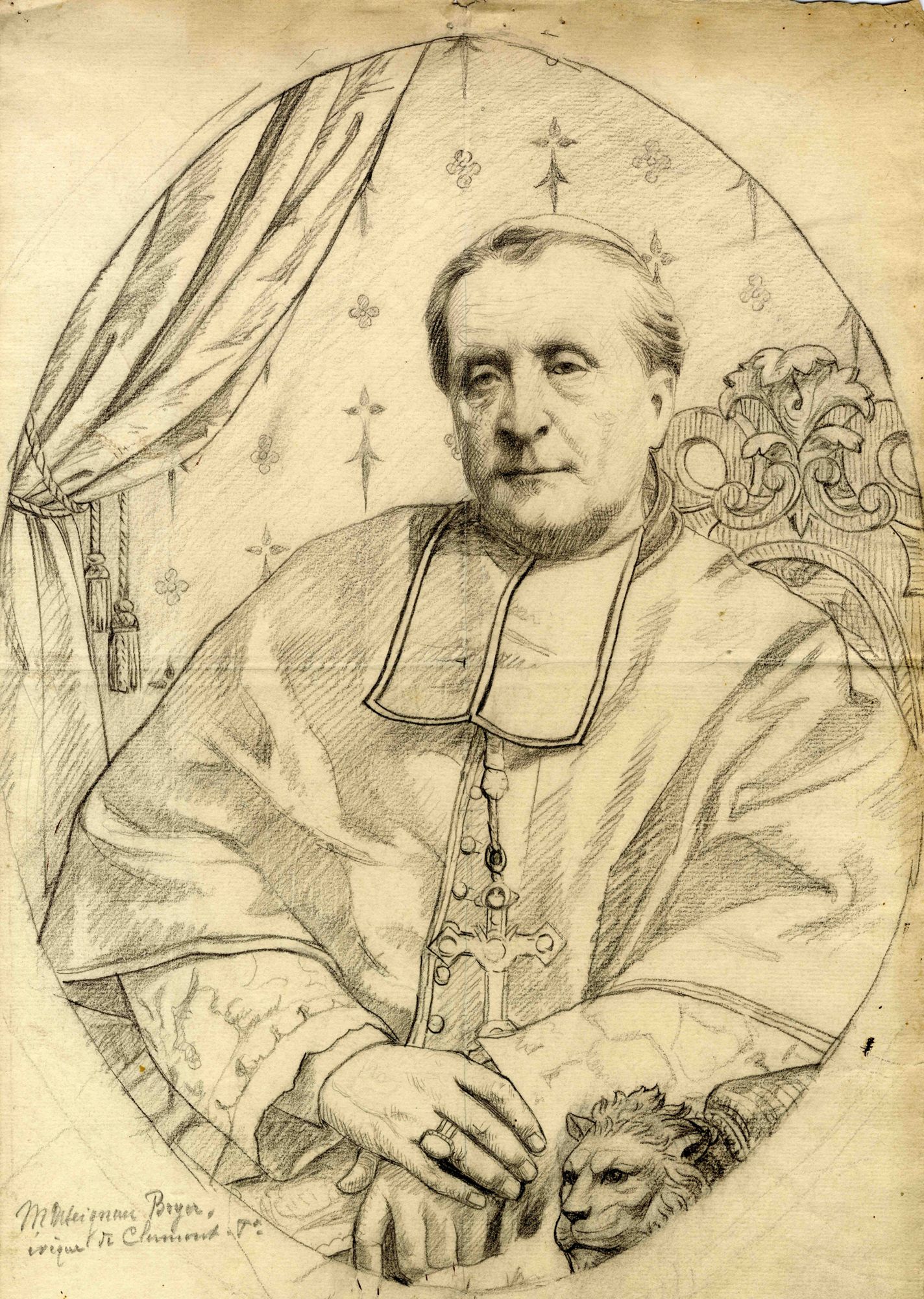 Antoine Montadat, « peintre-verrier et dessinateur, premier employé dans la maison Chatain », verrier clermontois, est l’auteur de ces dessins. Il a étudié la peinture à l’école des Beaux-Arts de Clermont-Ferrand dans les années 1870. Le portrait est fait d’après la photographie officielle du cardinal : on y reconnaît même le fauteuil à protome léonin. La marguerite héraldique du prélat est reprise, au naturel, dans l’encadrement.