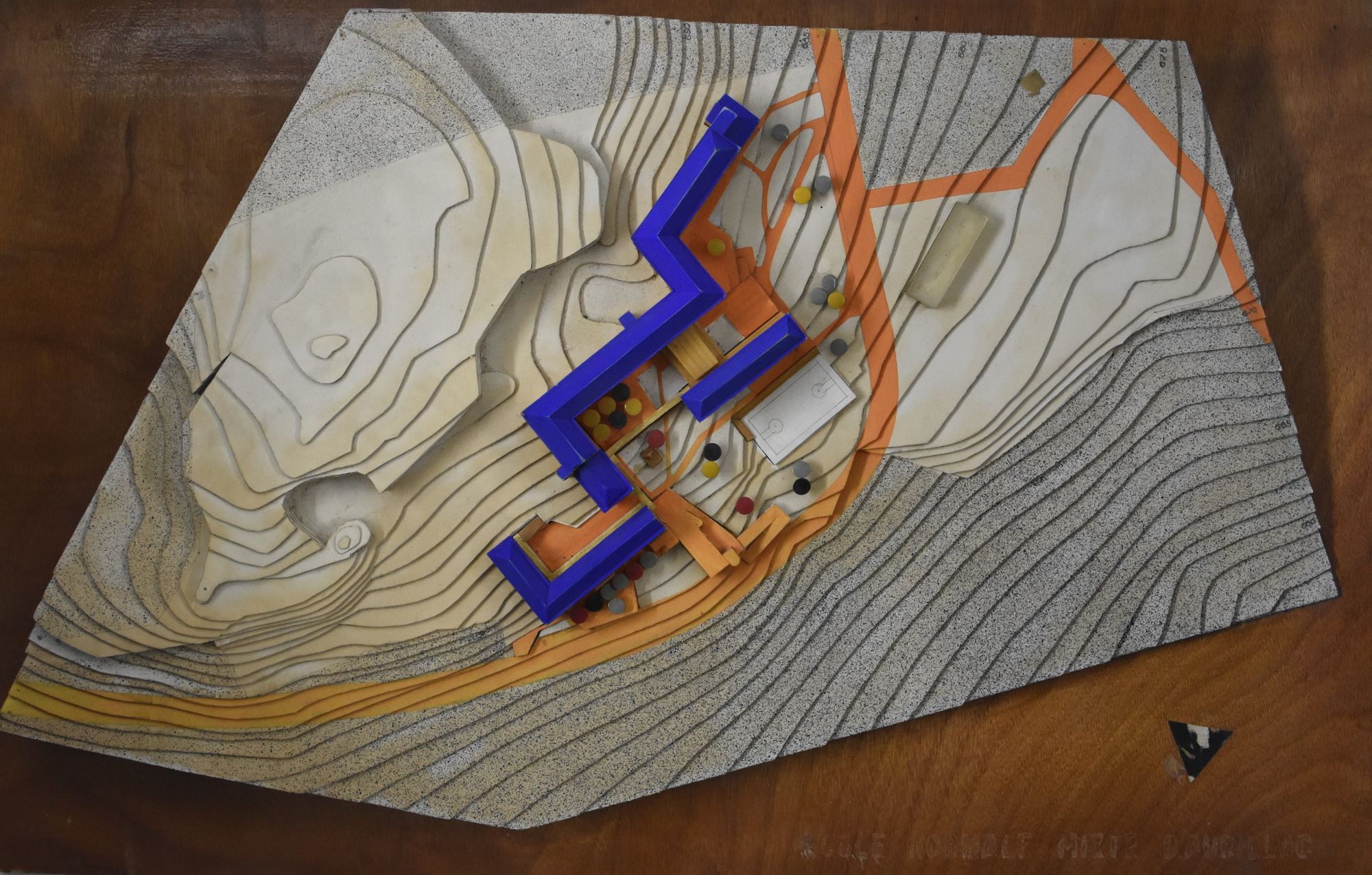 La maquette présentée porte l’inscription « Ecole normale mixte d’Aurillac » et il ne fait aucun doute qu’elle a été fabriquée dans le cadre de ce projet. Mais pour quel usage ? Cela reste un mystère. Elle pourrait avoir été utilisée dans le cadre du concours et semble porter un signe distinctif en forme de triangle noir accréditant cette thèse. Néanmoins, aucun document n’en fait mention et elle ne figure pas aux épreuves dudit concours. Elle semble avoir été construite après 1953 puisque le terrain figuré parait être celui du Roc Castanet mais ne correspond pas pour autant au projet définitif…