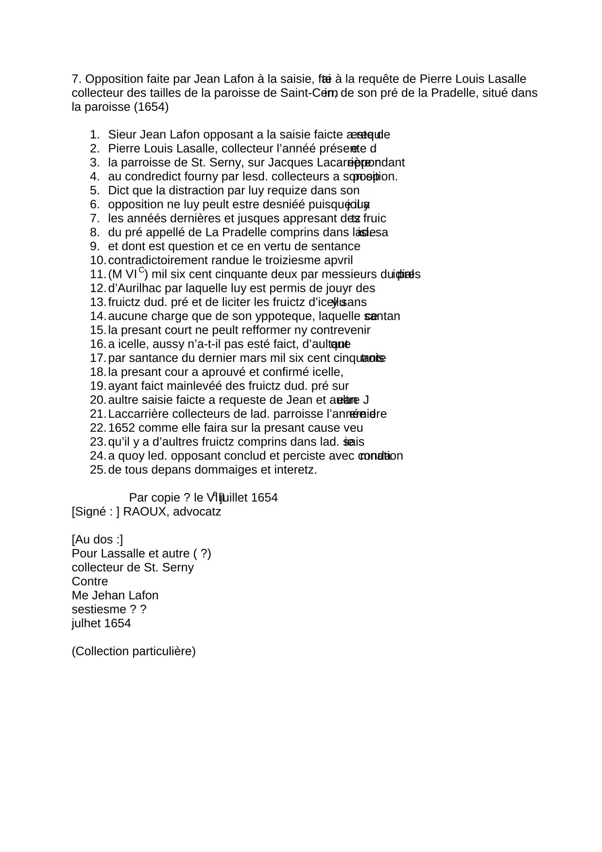 Opposition faite par Jean Lafon à la saisie, faite à la requête de Pierre Louis Lasalle collecteur des tailles de la paroisse de Saint-Cernin, de son pré de la Pradelle, situé dans la paroisse (1654) 1 2 2 2 Transcription (7.2 Ko)