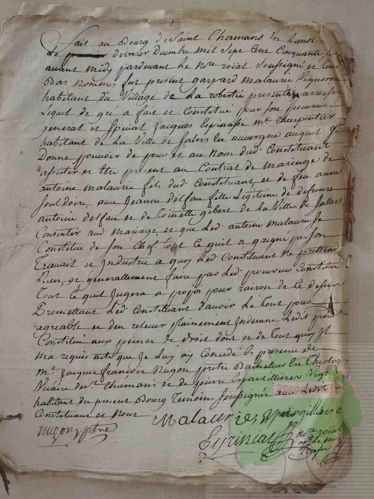 Provisions du roi : 14 juillet 1718. Successeur de Jean Meynial, notaire à Fontanges ; Henri Valette lui succède en 1759 (démission).