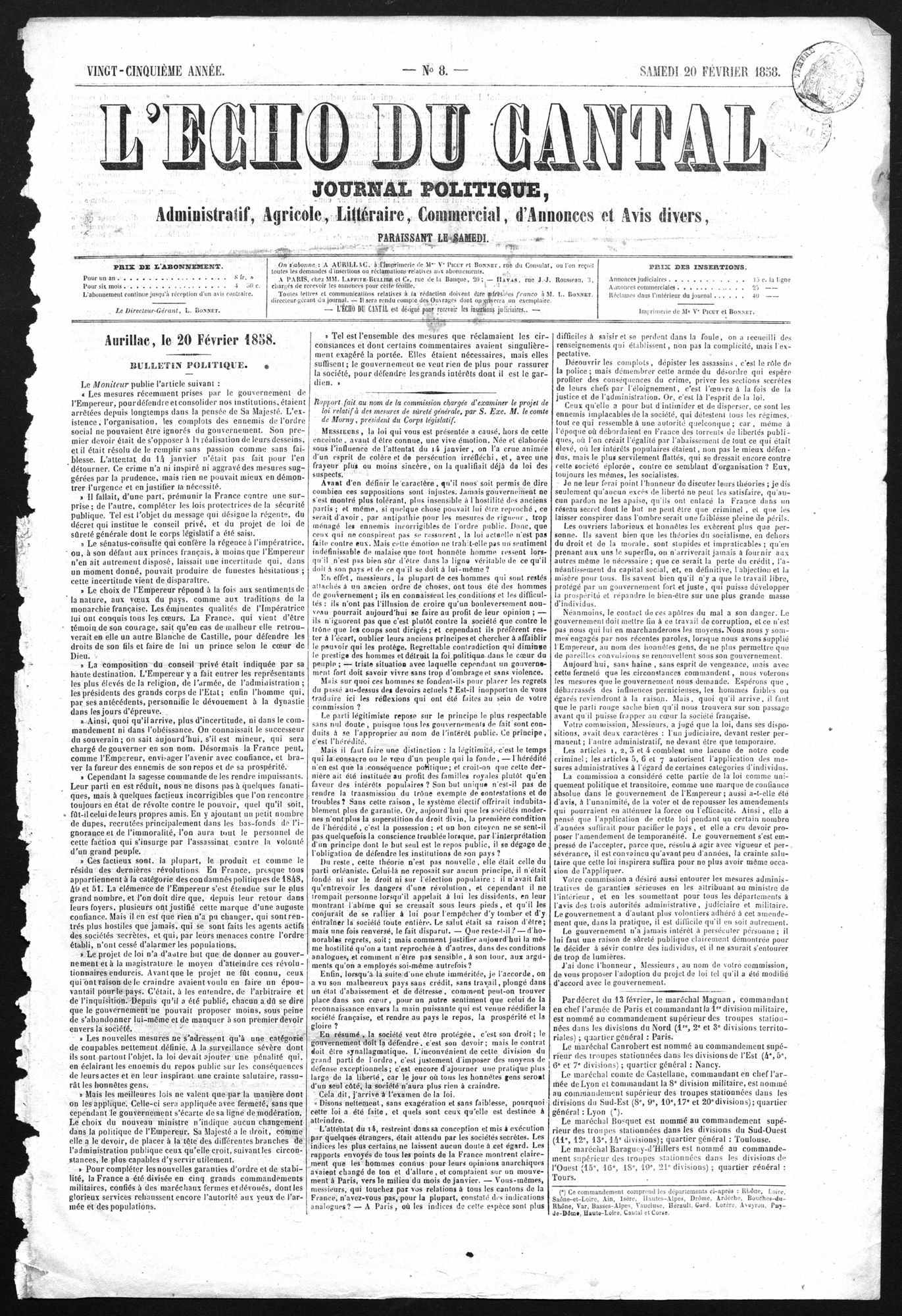 n° 8 : 20 février 1858, 2 JOUR 7, 1858, L'Echo du Cantal, Presse numérisée